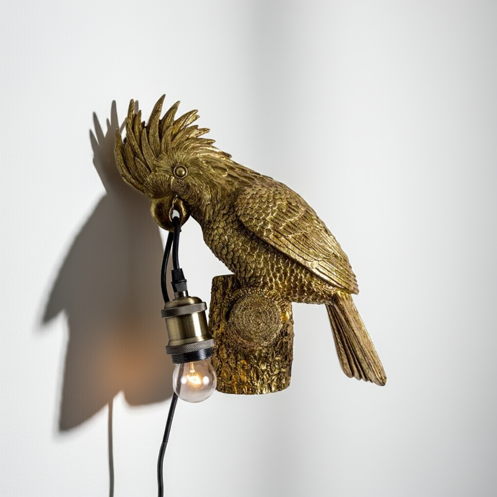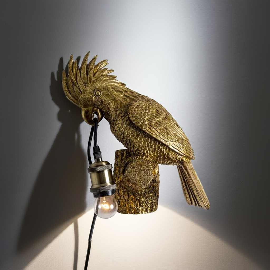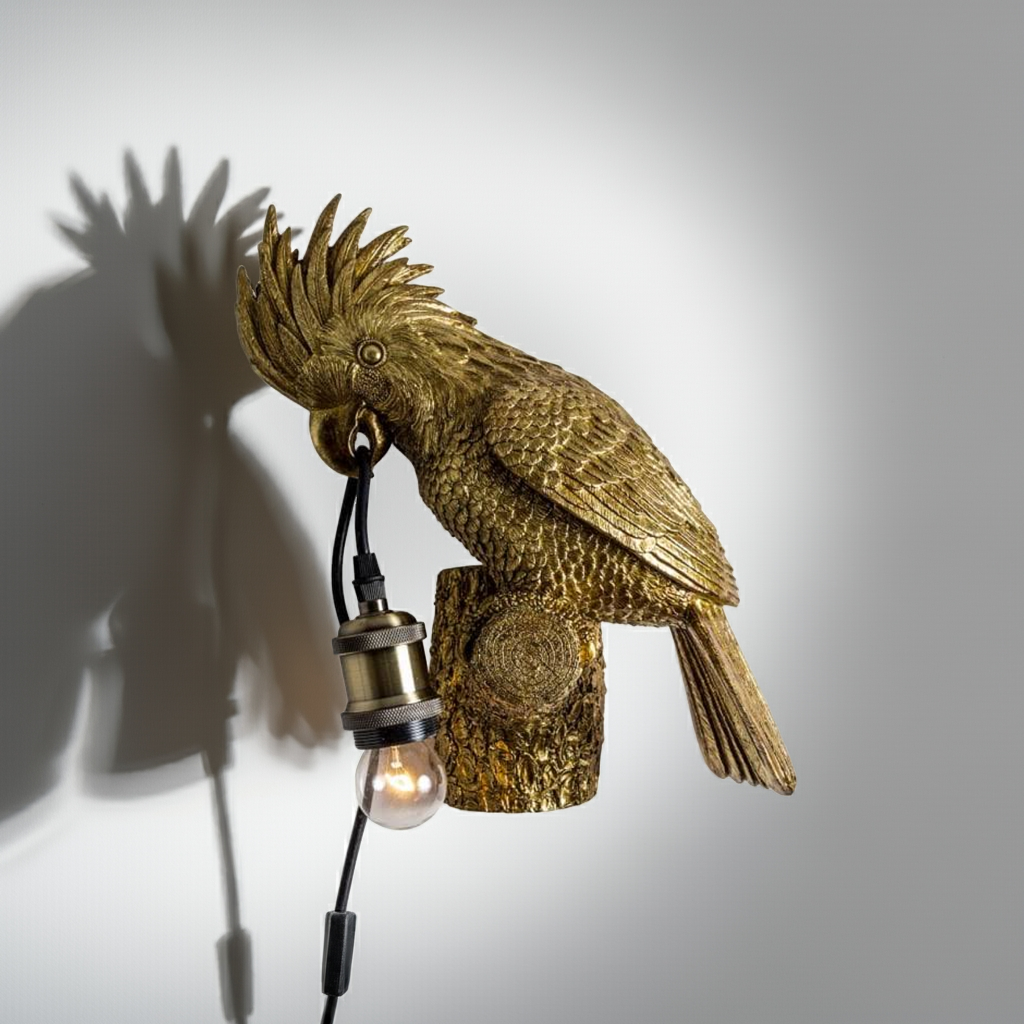 Add a touch of charm and sophistication to your home with our Antique Gold Cockatoo on Perch Wall Lamp. Made with high quality materials, this beautifully crafted lamp will bring a warm and inviting glow to any room. The bright golden color and unique design make it a truly eye-catching piece of wall decor that is sure to be loved by pet lovers and interior design enthusiasts alike. Elevate your home decor with this professionally crafted and one-of-a-kind wall lamp.