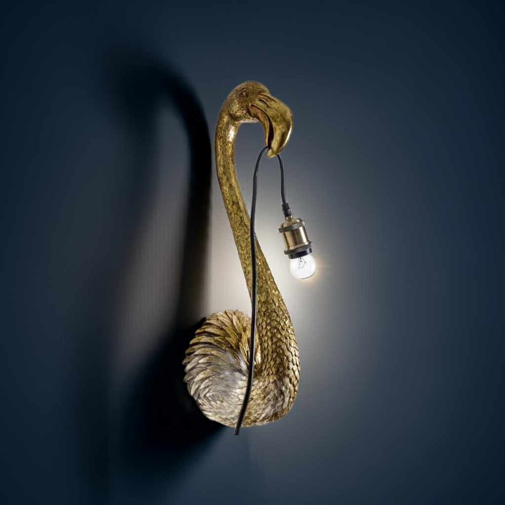 Experience exquisite lighting with the Antique Gold Flamingo Head Wall Lamp. This elegant addition to your decor adds a touch of sophistication and charm.
