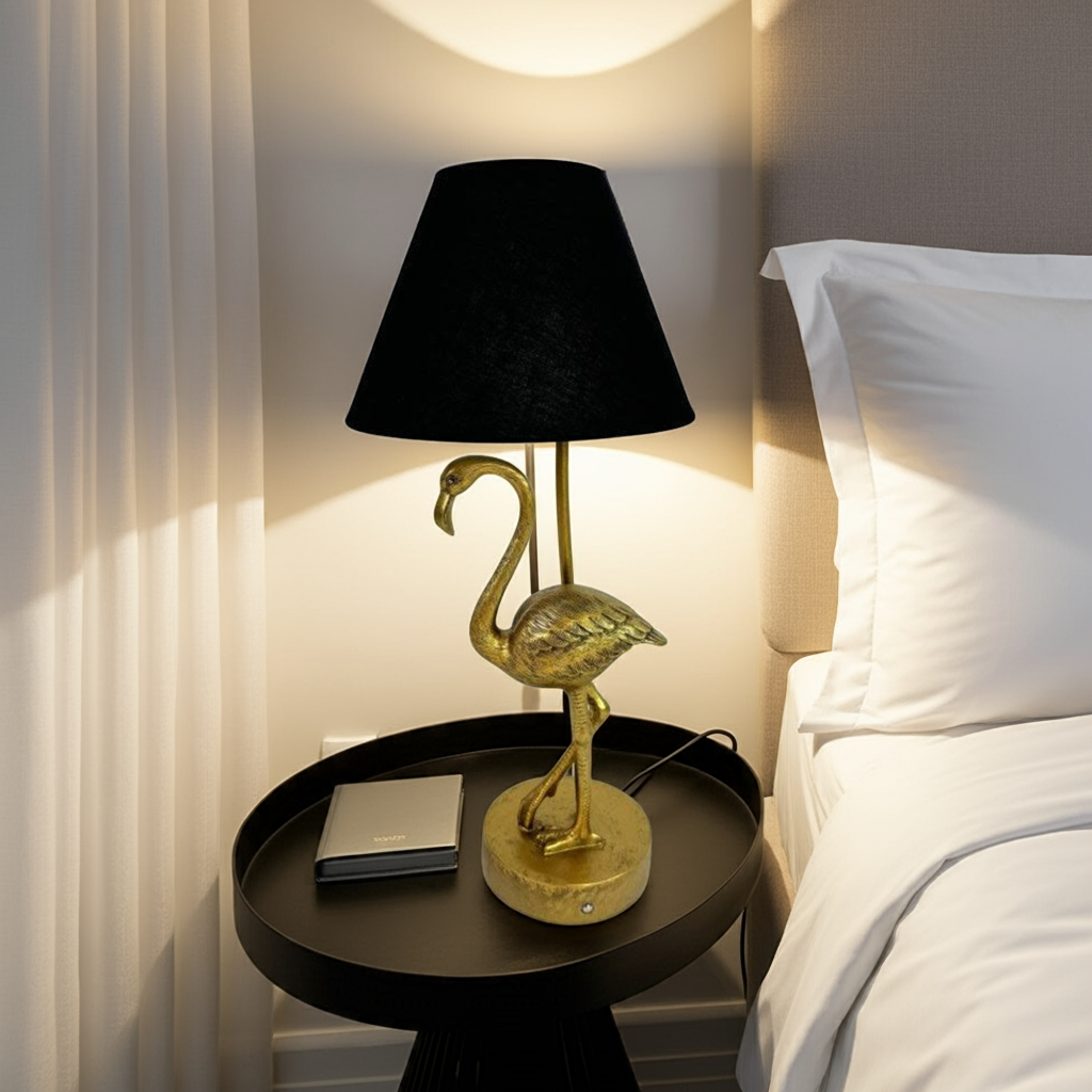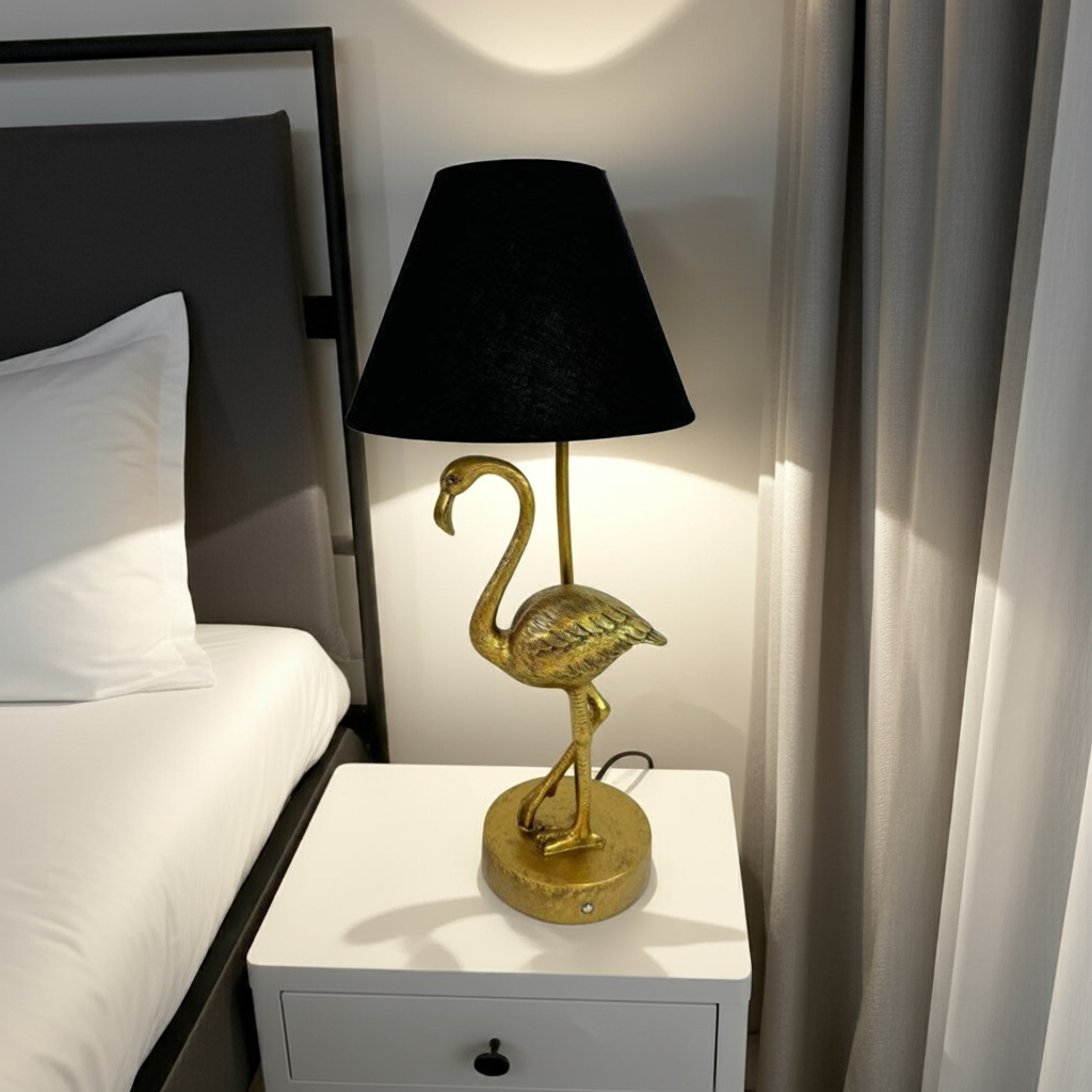 Illuminate your home with this elegant Antique Gold Flamingo Lamp. Its stunning design features a gracefully crafted flamingo base in antique gold, complemented by a sleek black shade. Enjoy the added convenience of 3 different light settings for your desired ambiance. Perfect for any room in need of a touch of sophistication.