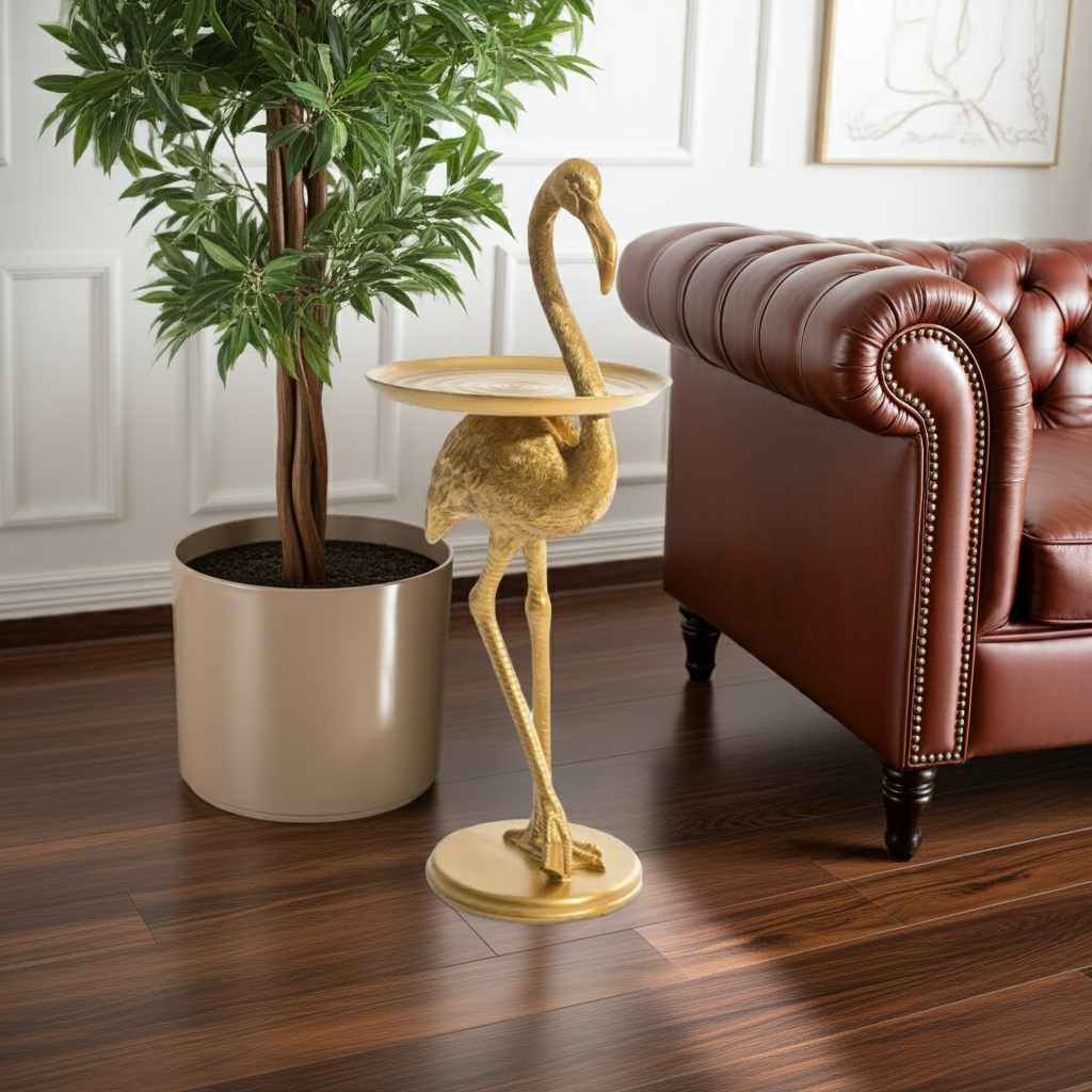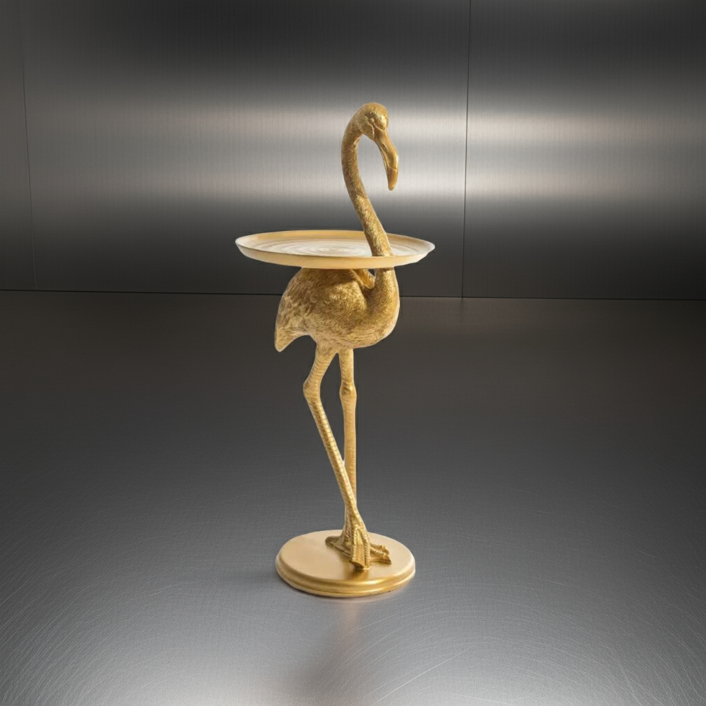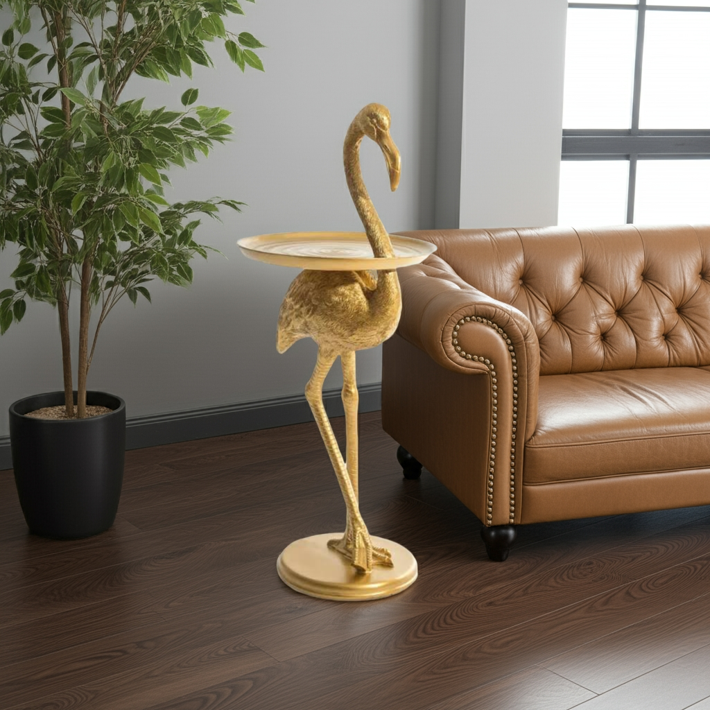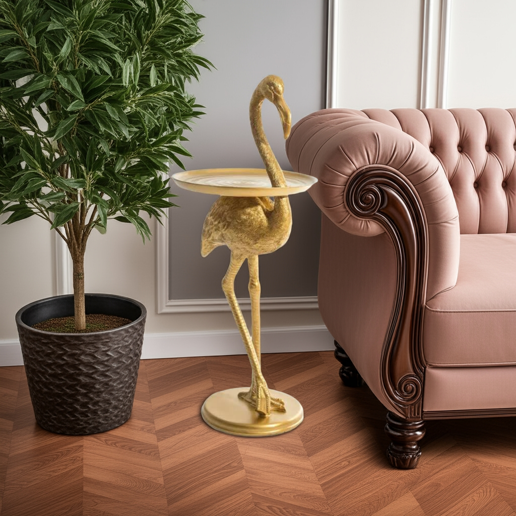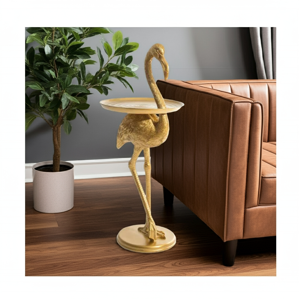 Experience the timeless elegance of the Antique Gold Flamingo Side Table. This expertly crafted piece adds a touch of sophistication to any room. Incorporate this beautiful table into your home to elevate your decor with its sleek design and flawless craftsmanship.