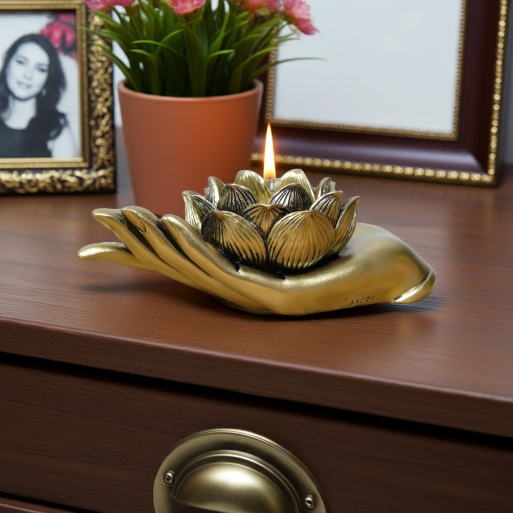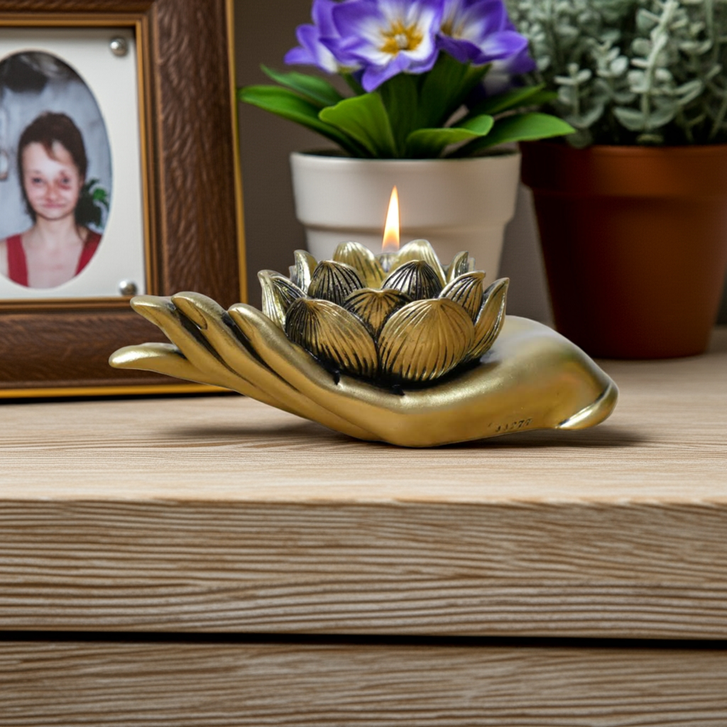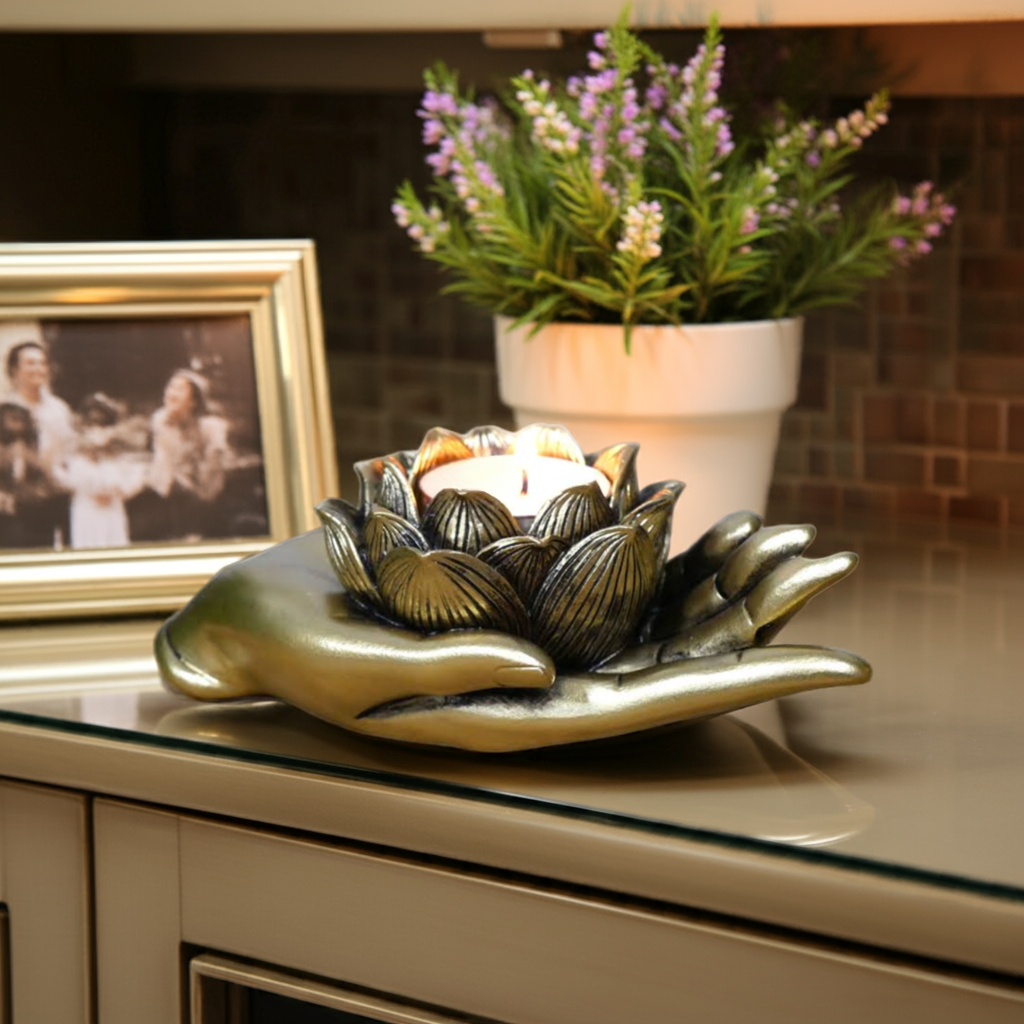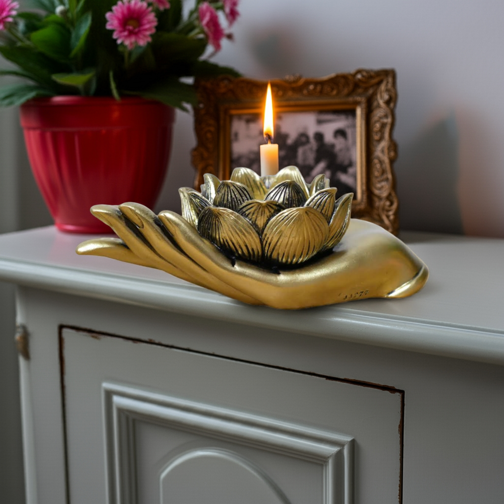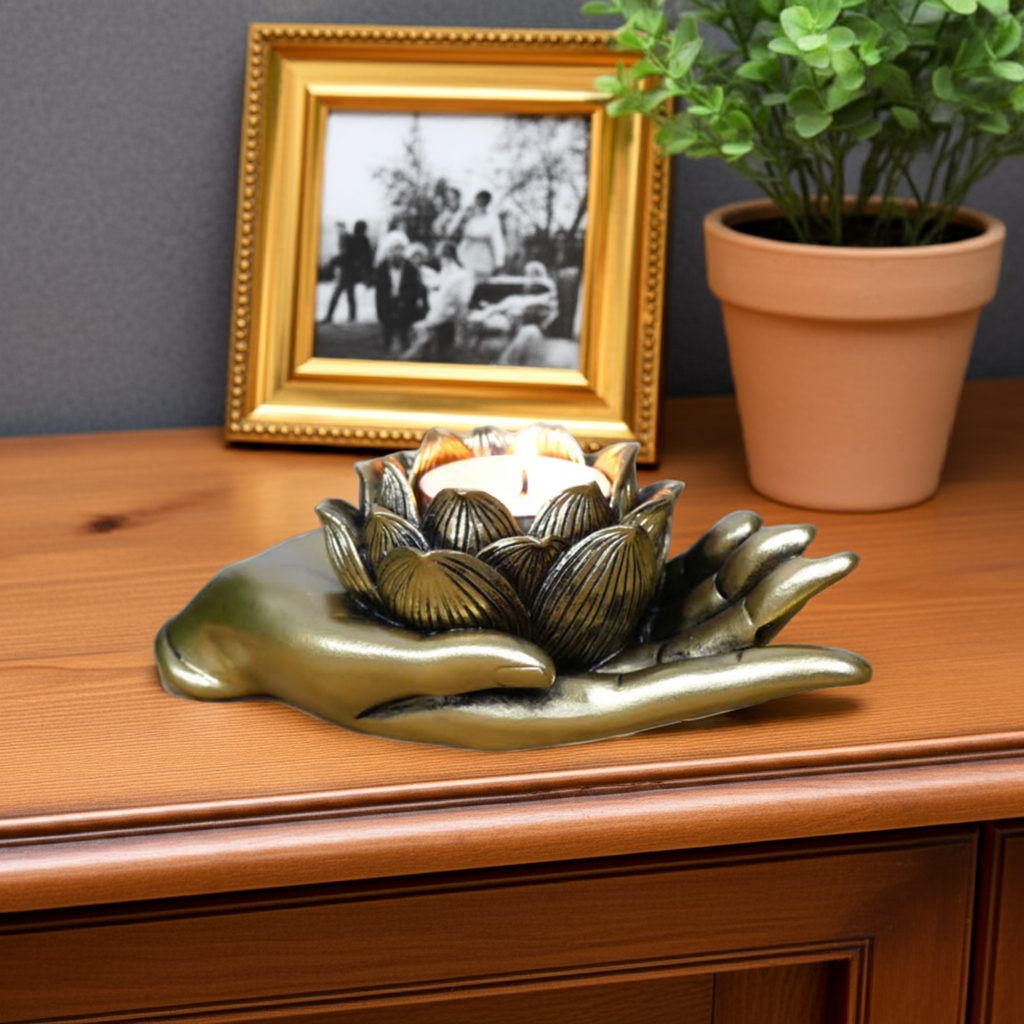 Expertly crafted from durable resin, this Antique Gold Lotus Flower on Hand Tealight/Candle Holder adds an elegant touch to any room. The intricate lotus flower design adds a sense of tranquility, while the antique gold finish adds a touch of sophistication. Perfect for holding tealights or candles, this holder is a beautiful addition to any home decor.