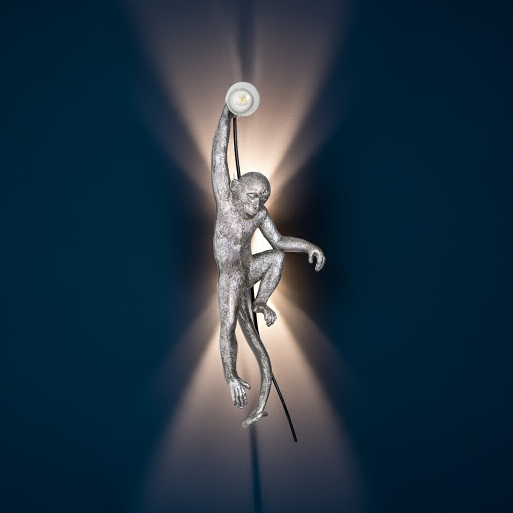 This product description highlights the Antique Silver Climbing Monkey Wall Lamp, a unique and elegant lighting option. With its antique silver finish and intricate monkey climbing design, this wall lamp brings a touch of sophistication to any room.