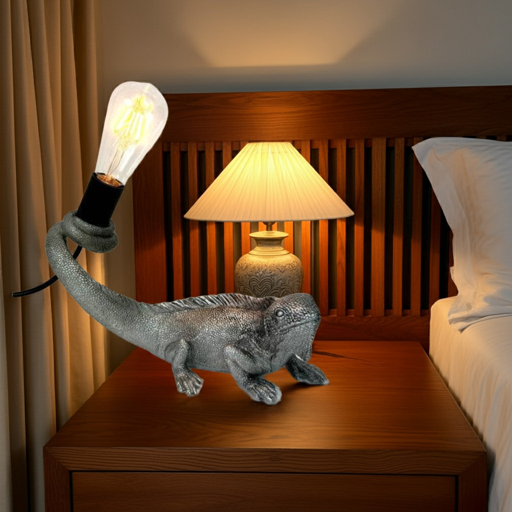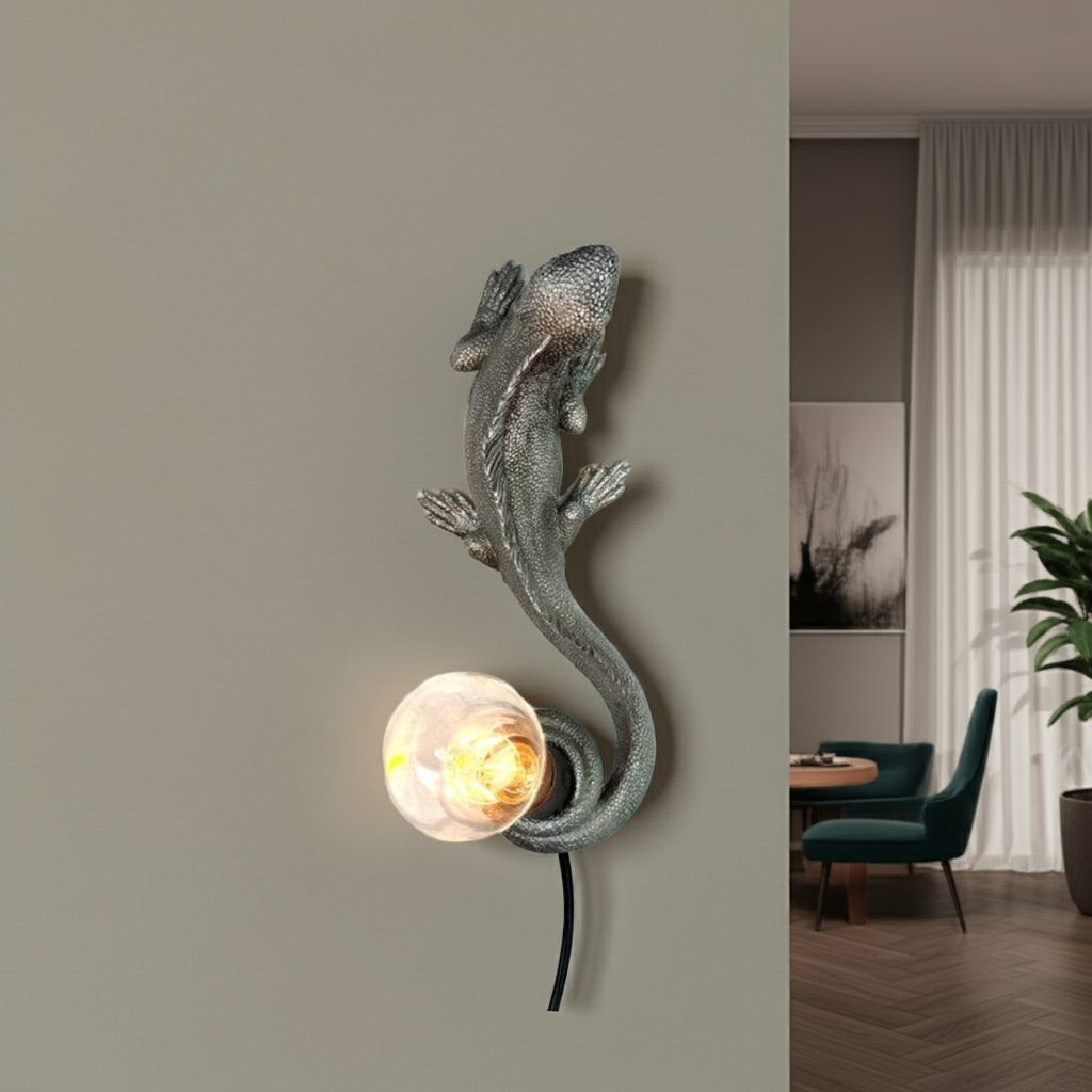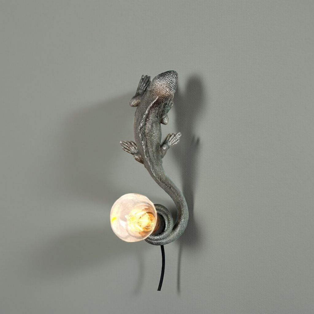 Enhance your space with our Antique Silver Iguana Wall/Table Lamp. Featuring a unique antique silver finish and intricate iguana design, this lamp adds a touch of elegance to any room. It can be used as a wall lamp or a table lamp, providing versatile lighting options. Experience the perfect blend of style and functionality with this one-of-a-kind piece.