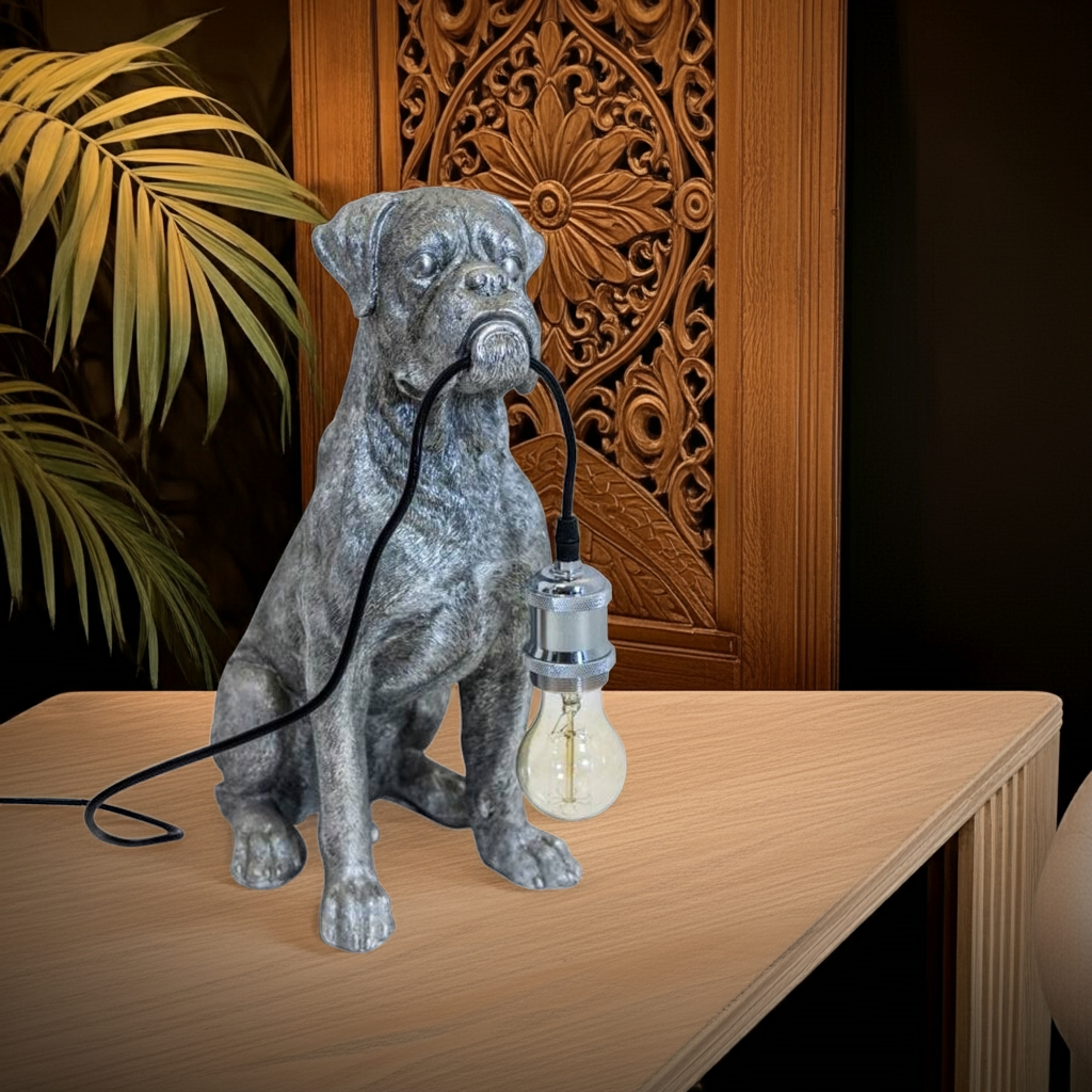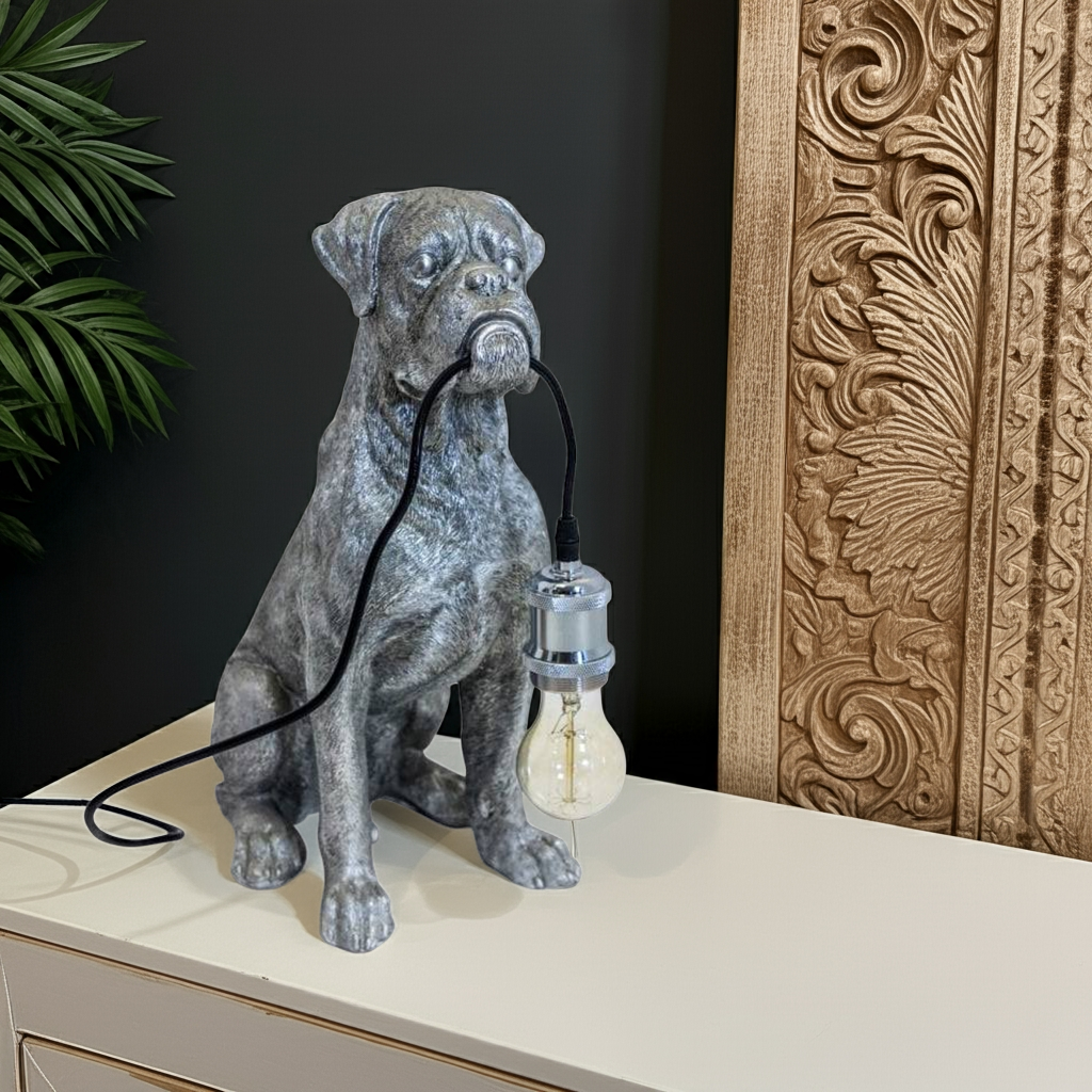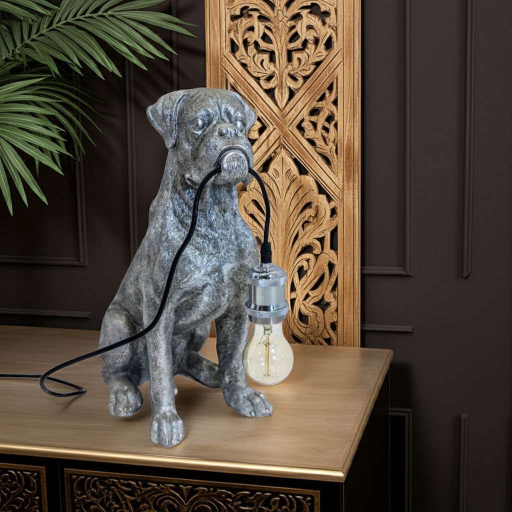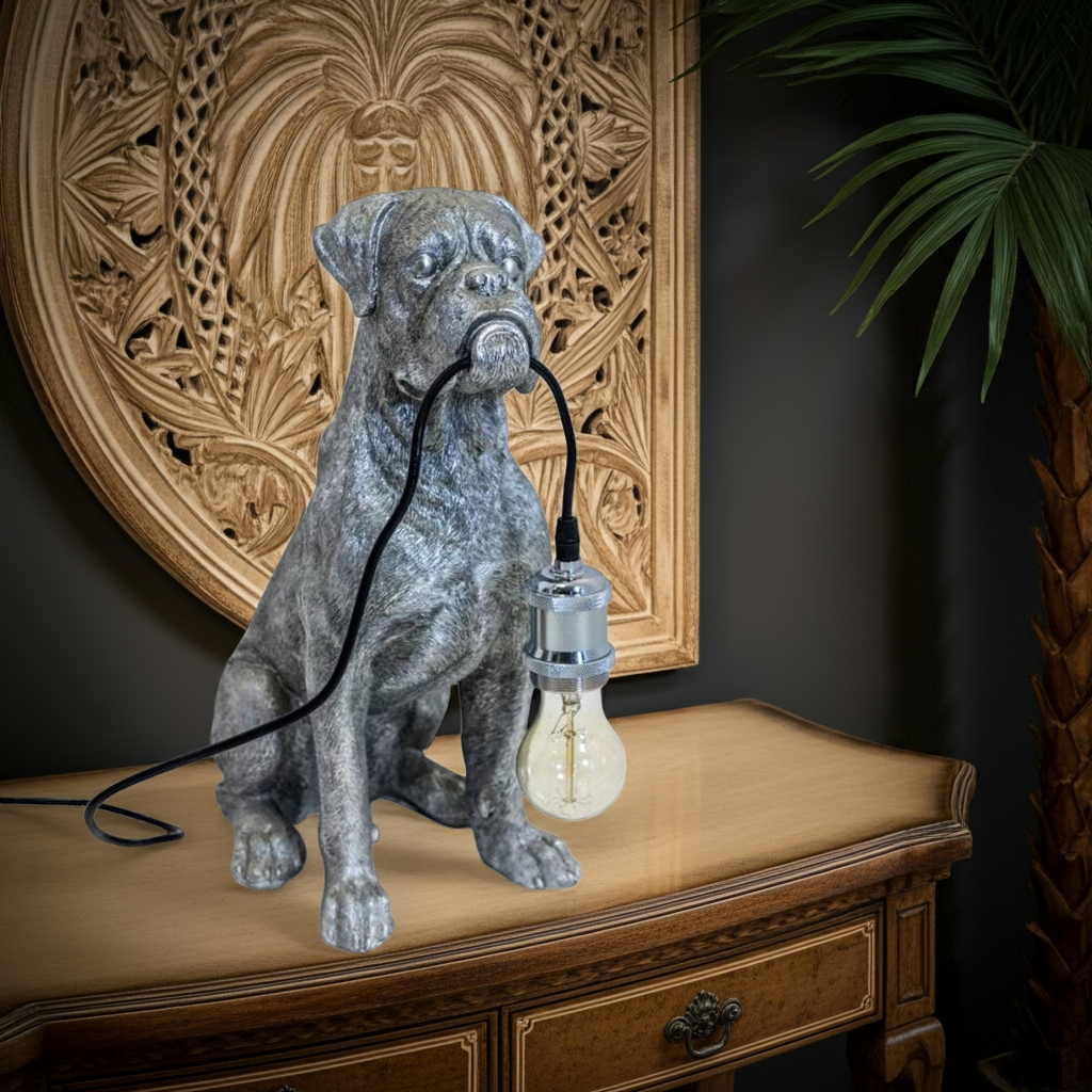 This Antique Silver Sitting Boxer Dog Table Lamp adds a touch of elegance to any room with its antique silver finish and detailed boxer dog design. Crafted with expert precision, this lamp is a unique and stylish addition to any home decor. Illuminate your space while showcasing your love for dogs.