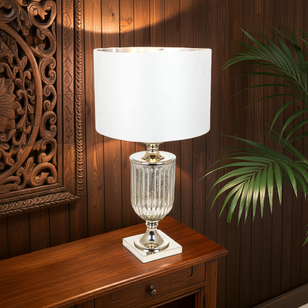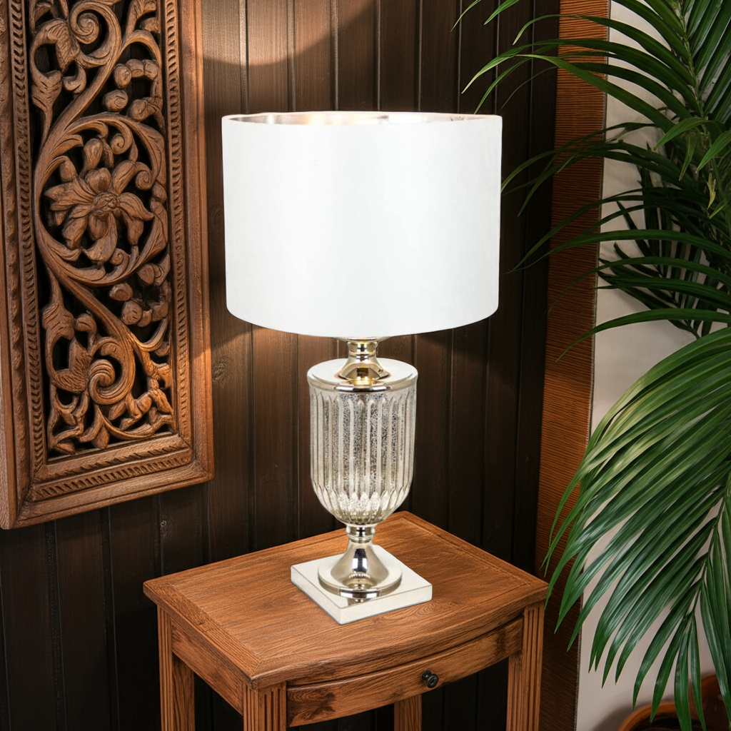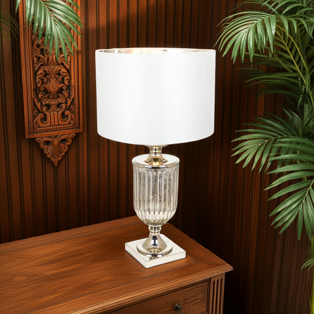Introduce elegance into your space with our ANTIQUED GLASS URN LAMP. The stunning design features a unique silver velvet cylinder shade that adds a touch of luxury to any room. Crafted with high-quality materials, this lamp is built to last and will elevate your home decor effortlessly.