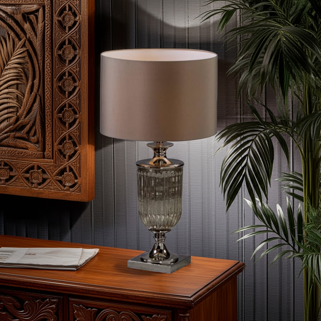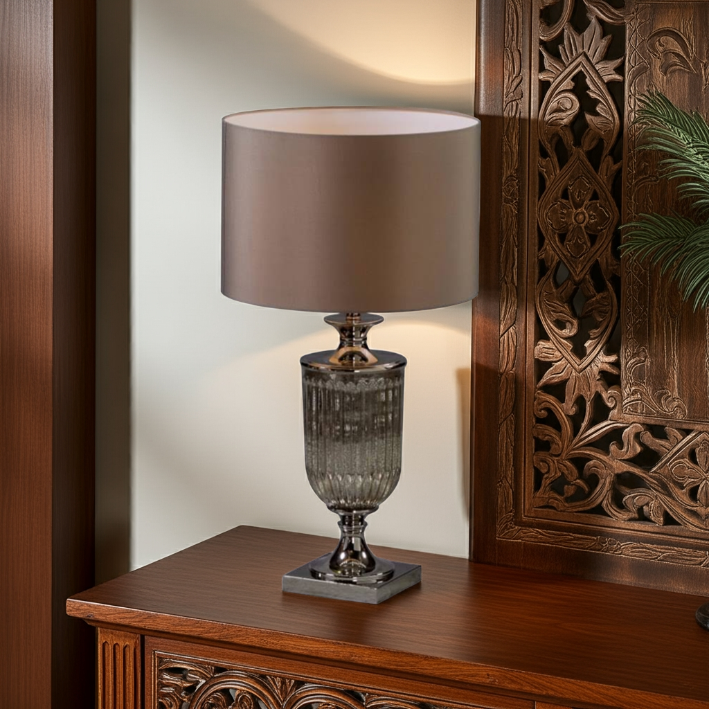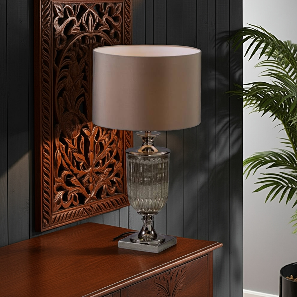 Experience the elegant charm of our Antiqued Glass Urn Lamp. Made with hand-blown glass, this lamp features a graceful urn shape and is complemented by a taupe cylinder shade. Illuminate your space with its warm glow and add a touch of sophistication to any room.