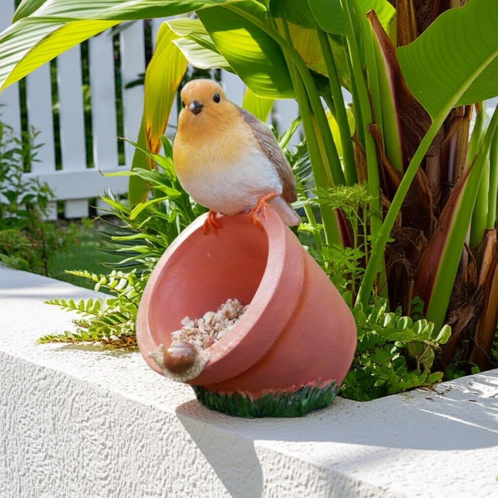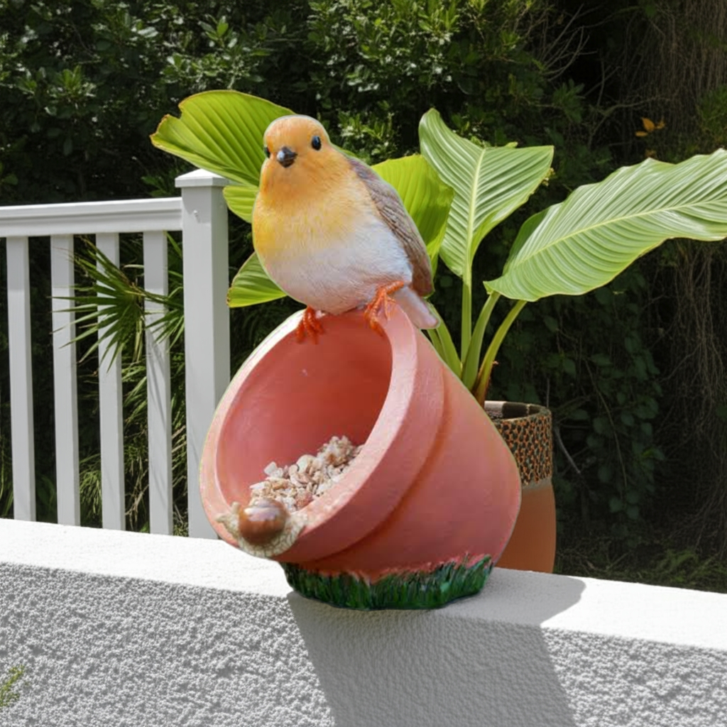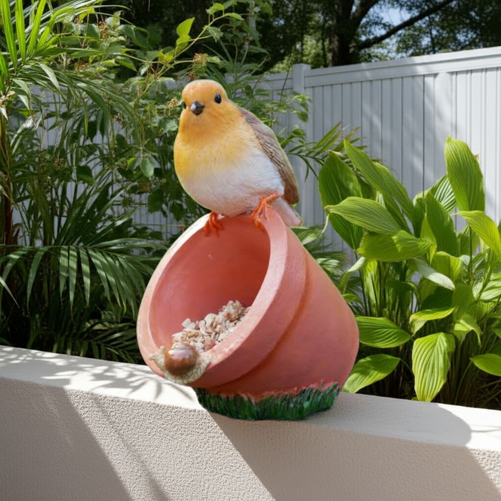 This eye-catching bird feeder features a cute Robin sitting on a pot, making it a charming addition to any outdoor space. Made specifically for bird lovers, it adds a touch of whimsy while providing a functional way to attract feathered friends.