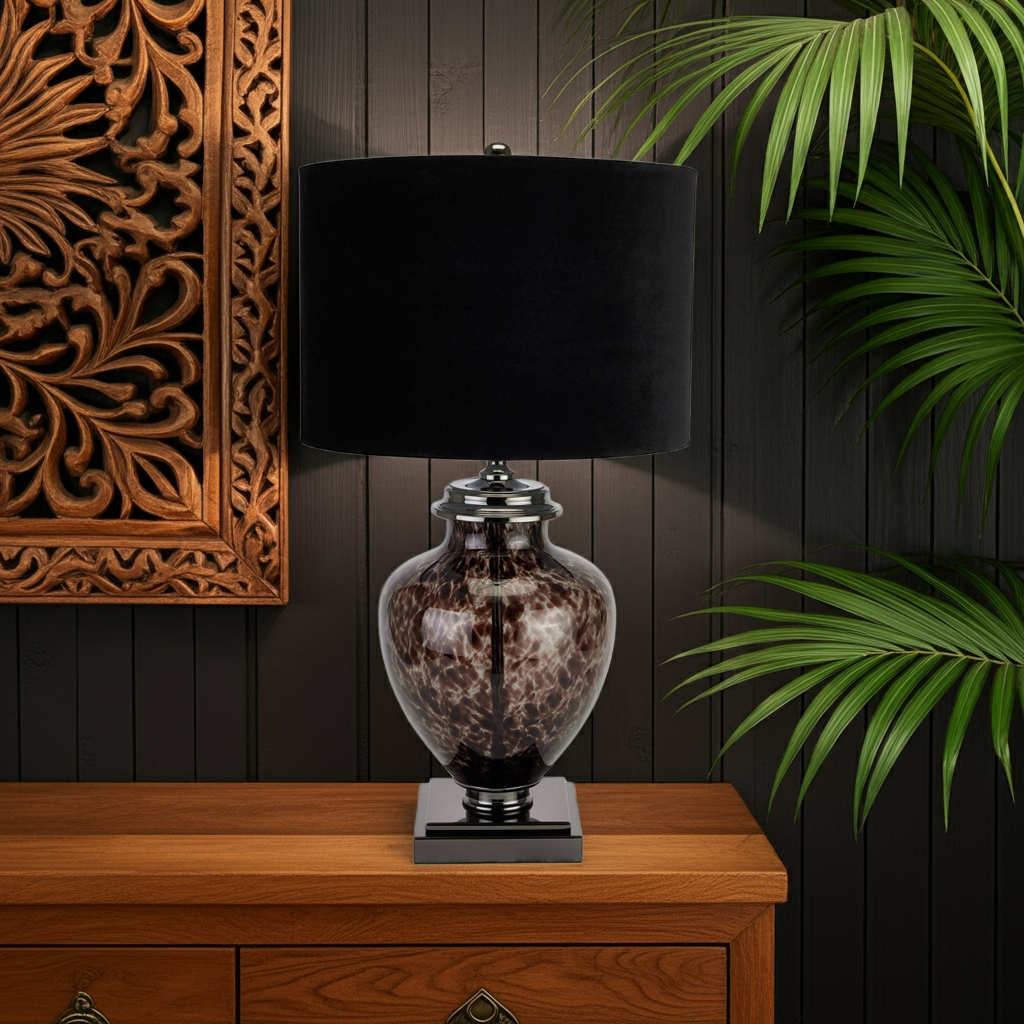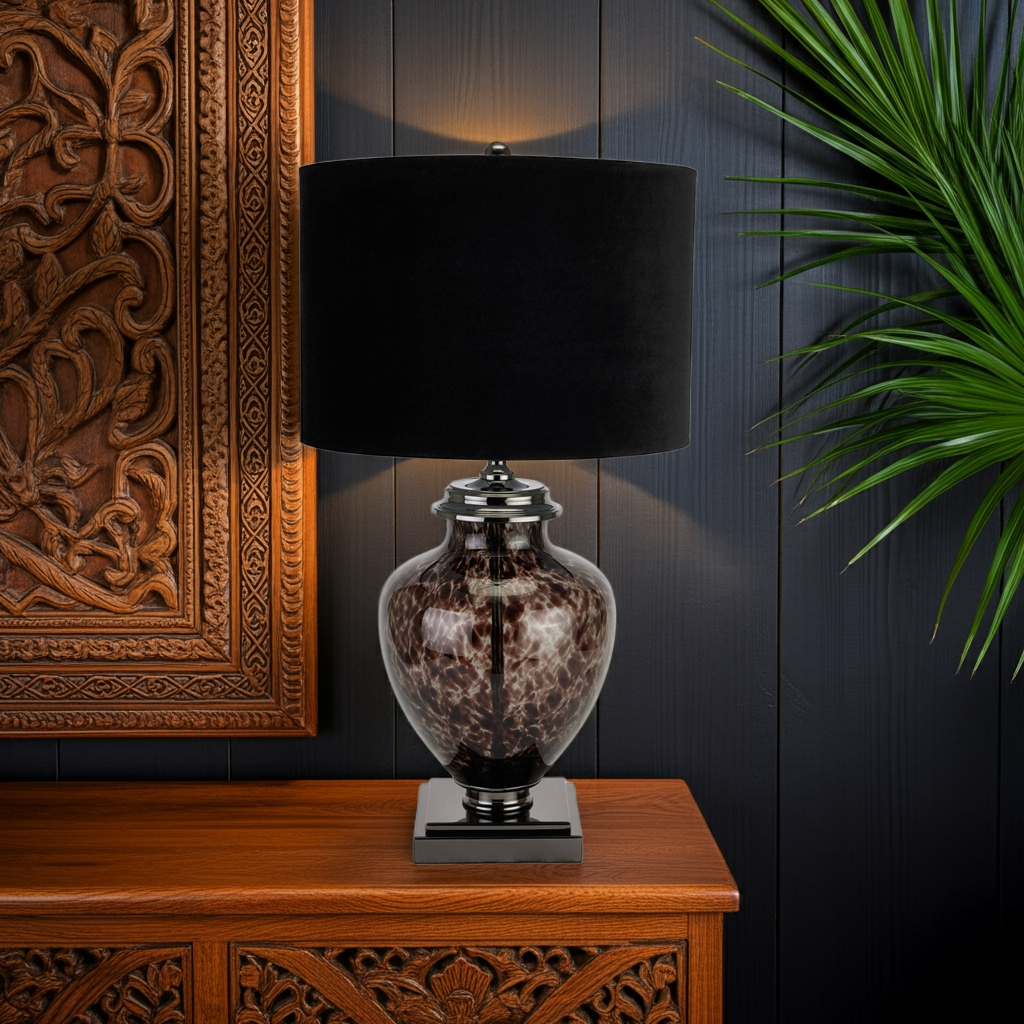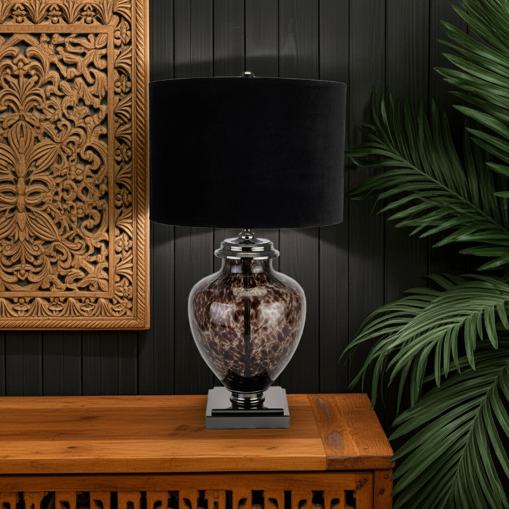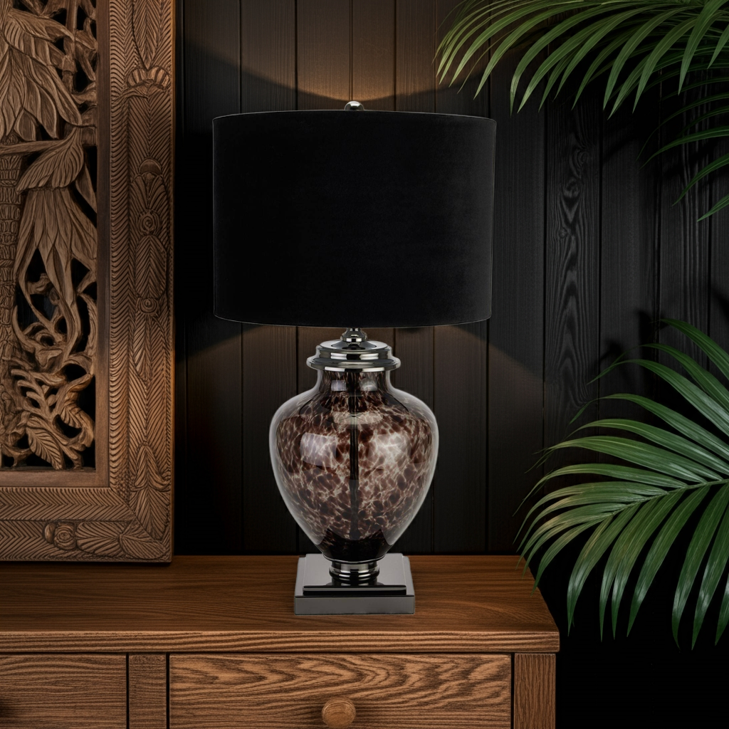 The Black Dapple Perugia Lamp features a unique and sought after 'dappled' effect, hand painted onto dual coloured glass. Its stylish and visually interesting shape adds a touch of elegance to any room, and the included black velvet shade completes the sophisticated look.