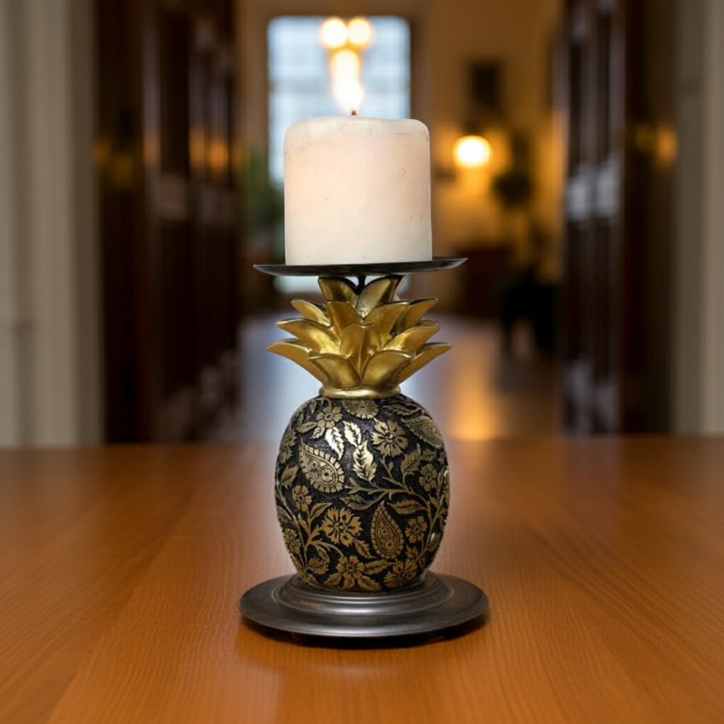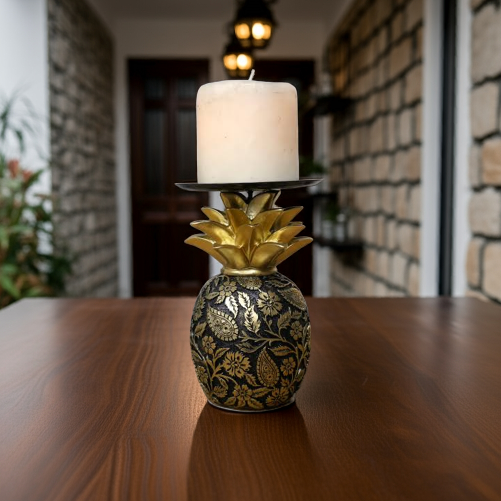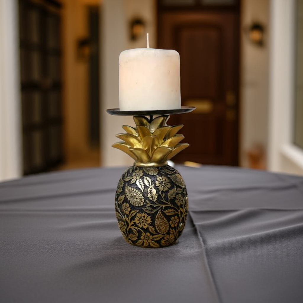 Introducing our Black & Gold Pineapple Candle Holder, adorned with stunning golden artwork. Bring a touch of elegance to any room with this unique and eye-catching piece. A must-have for any candle enthusiast or home decor lover.