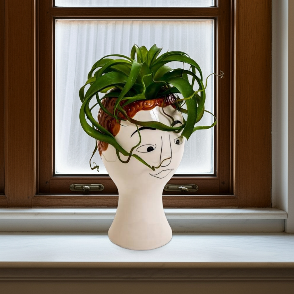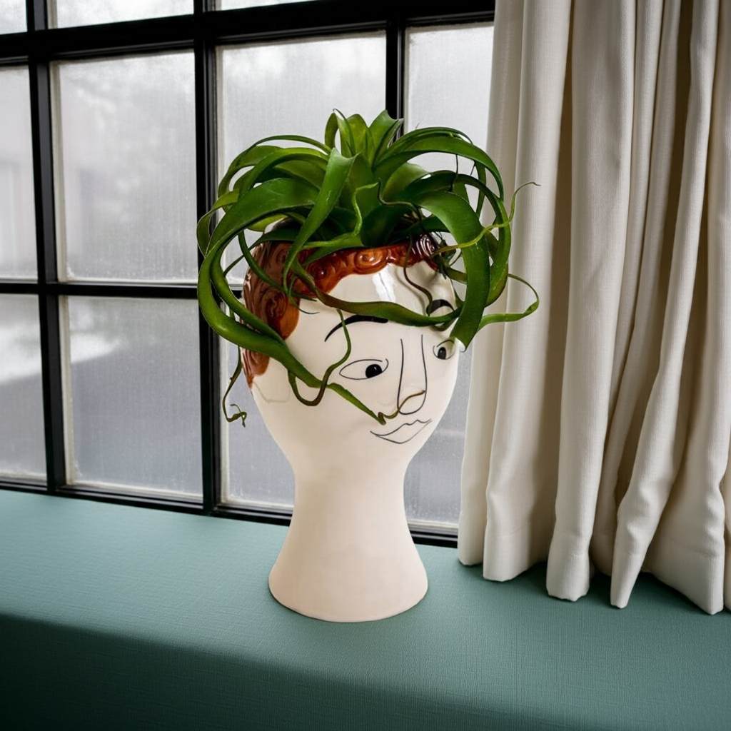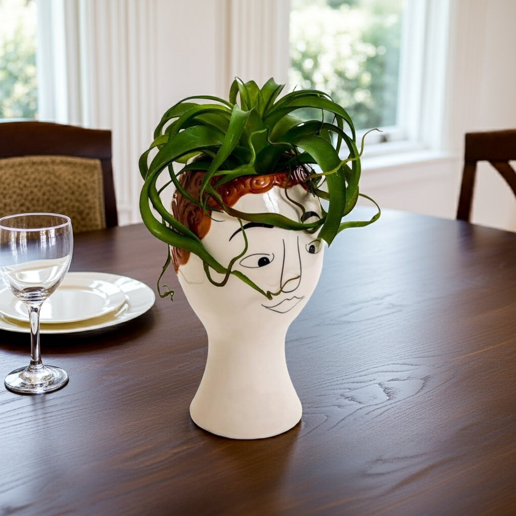 Introducing our Ceramic Doodle Man's Face Vase - Redhead, perfect for adding an artistic touch to any room. Made of durable ceramic, this vase showcases a unique design of a man's face with intricate doodle details. Its redhead coloring adds a pop of color to your decor. Elevate your space with this stylish and functional vase.