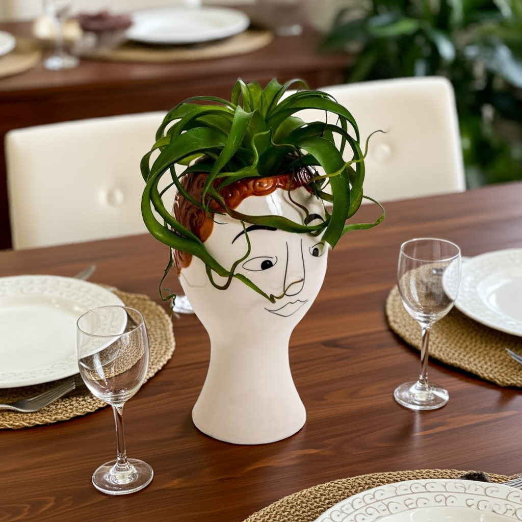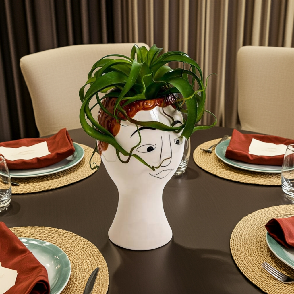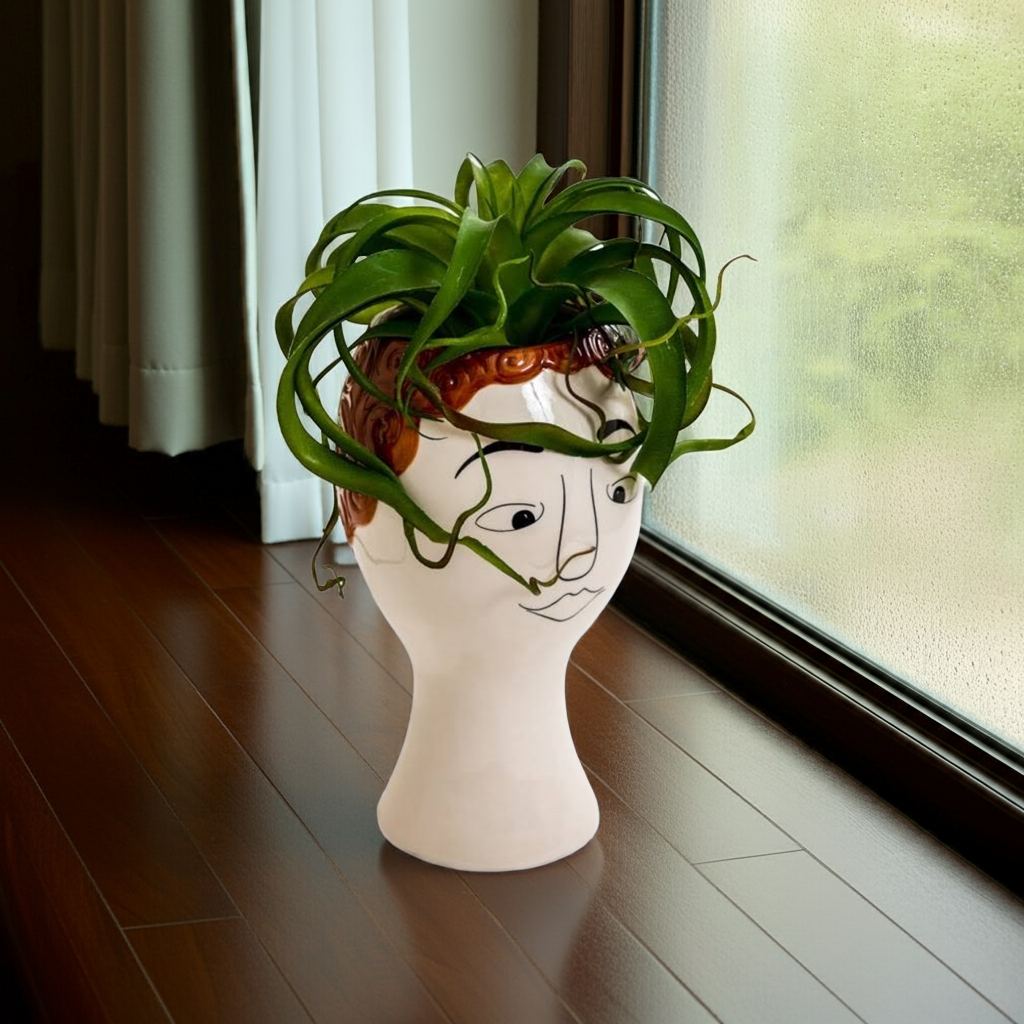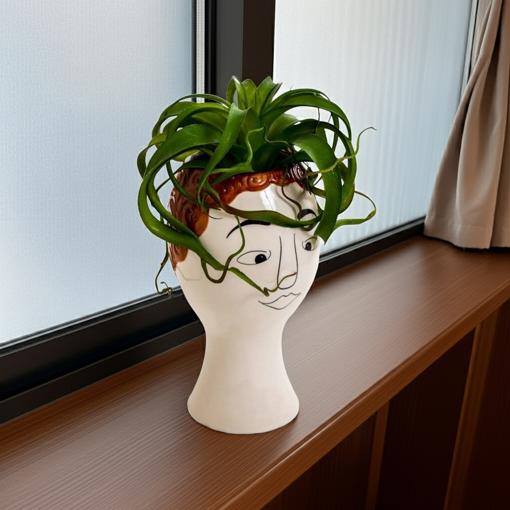 Introducing our Ceramic Doodle Man's Face Vase - Redhead, perfect for adding an artistic touch to any room. Made of durable ceramic, this vase showcases a unique design of a man's face with intricate doodle details. Its redhead coloring adds a pop of color to your decor. Elevate your space with this stylish and functional vase.