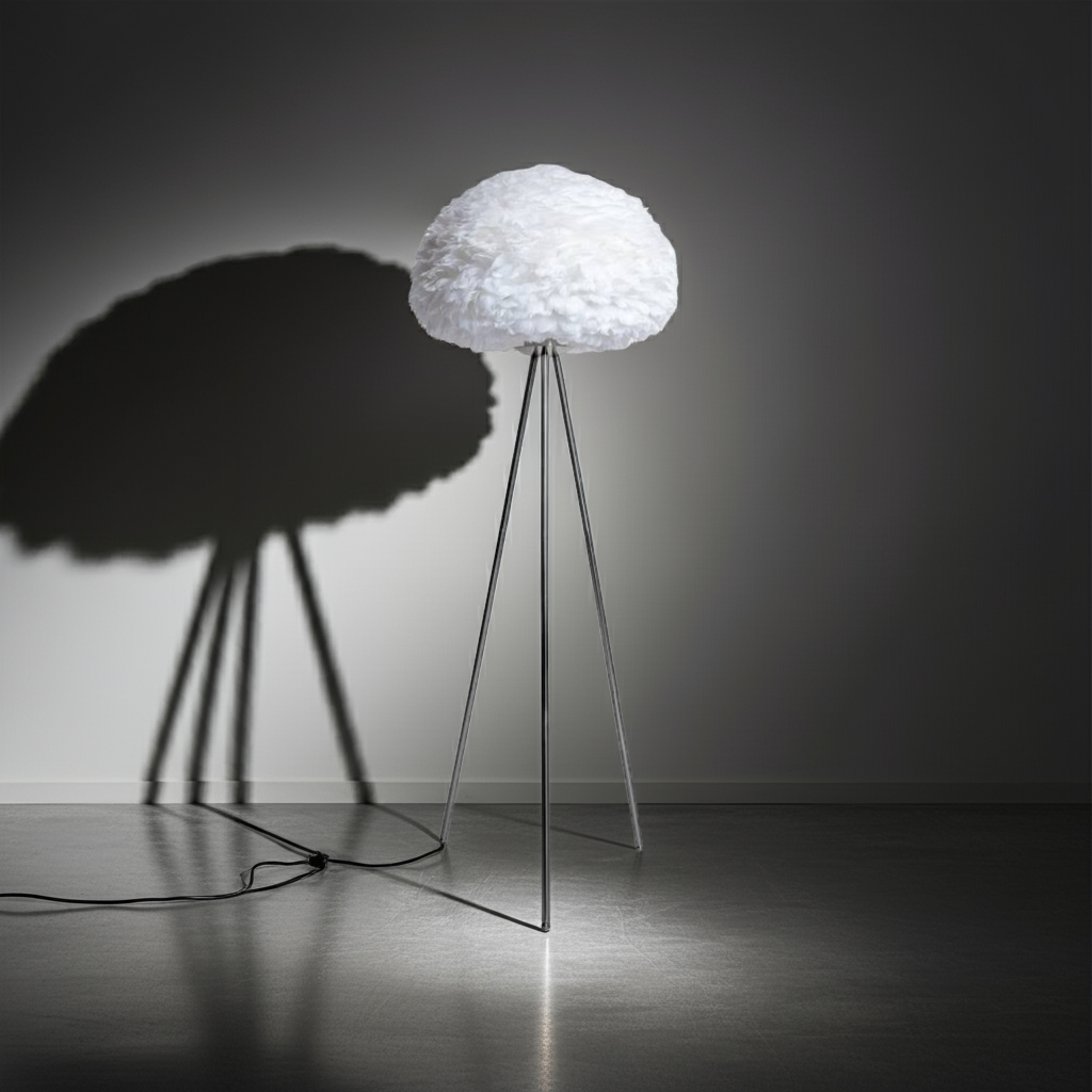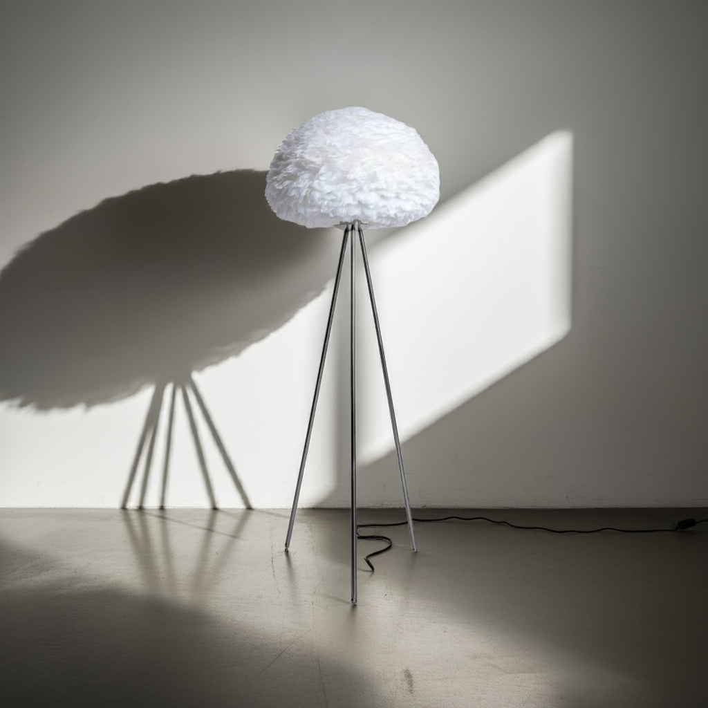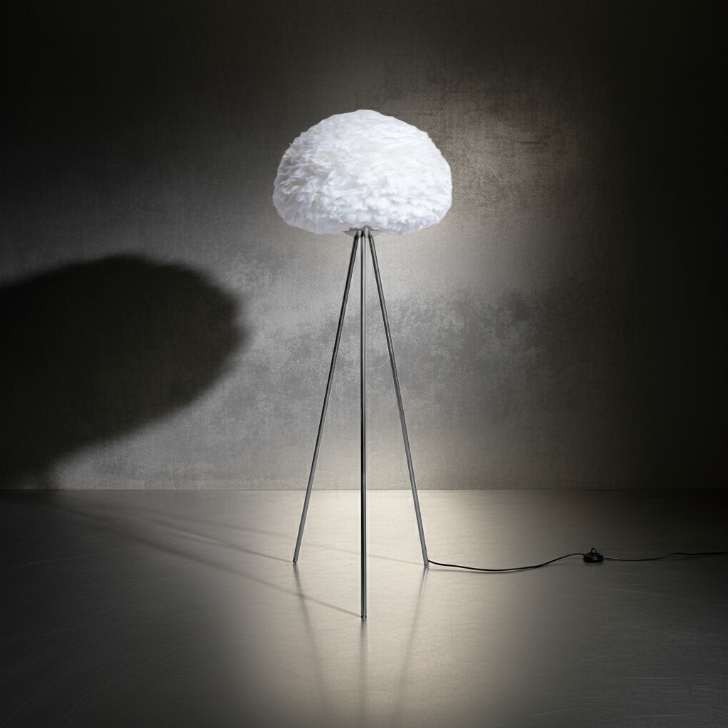 Elevate your living space with this Chrome Tripod Floor Lamp featuring a distinctive white feather shade. Its sleek chrome tripod base offers sturdy support and a modern aesthetic, while the feather shade diffuses light softly, creating a warm and inviting ambiance. Ideal for adding a touch of sophistication and texture, this lamp combines contemporary design with subtle elegance, making it a refined lighting choice for any room.