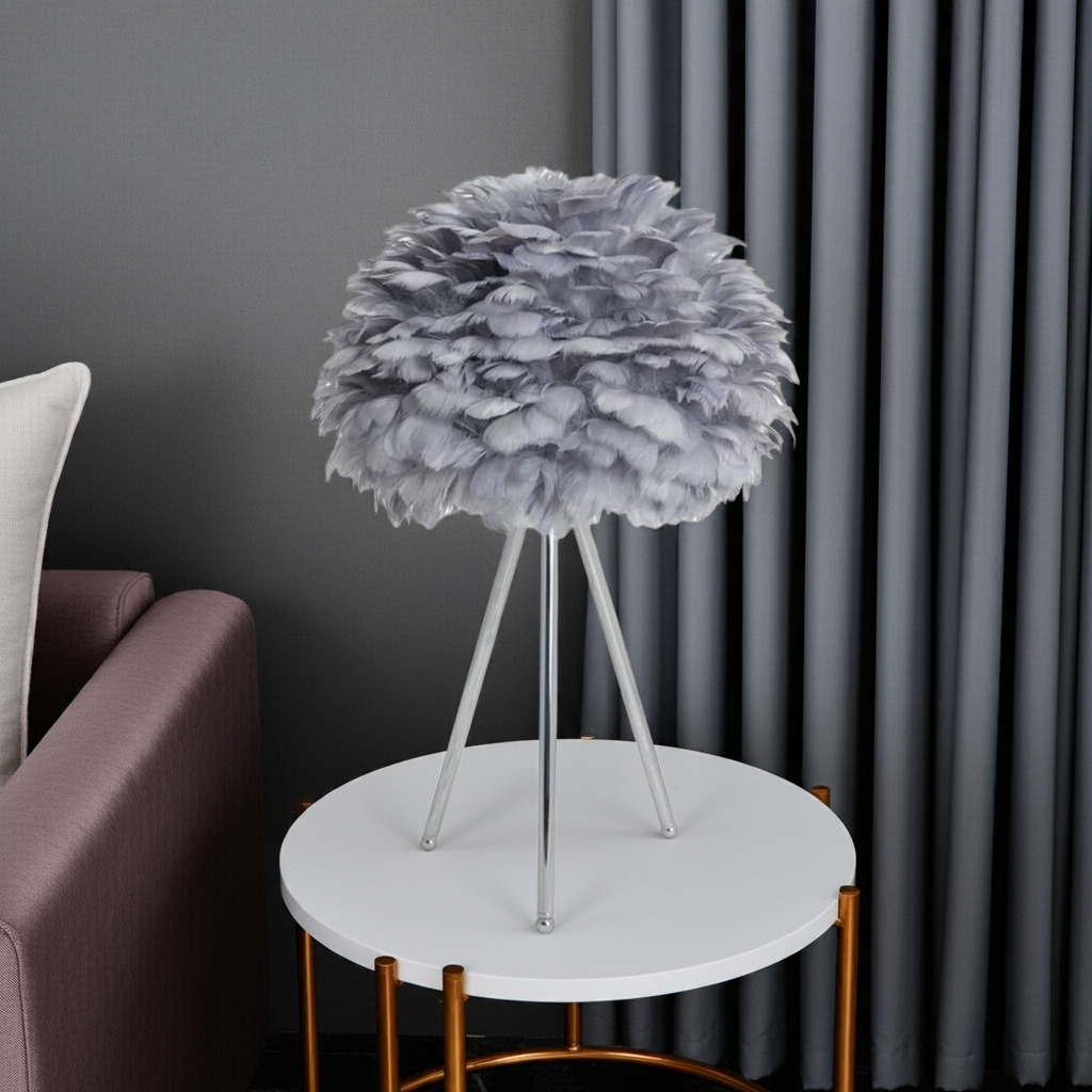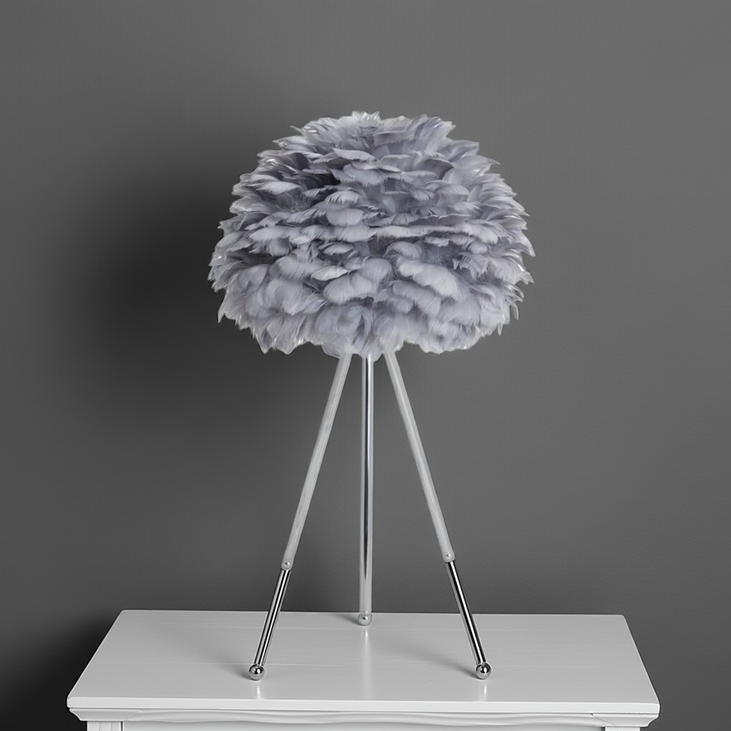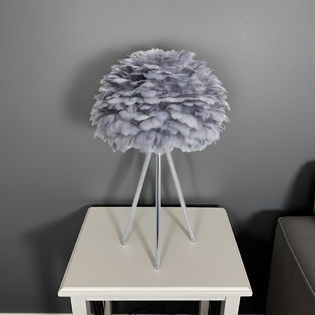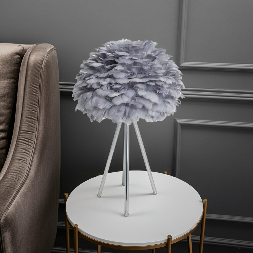 Elevate your interior with this Chrome Tripod Table Lamp featuring a distinctive grey feather shade. The sleek chrome tripod base offers stability and a modern aesthetic, while the soft feather shade diffuses light gently, creating a sophisticated ambiance. Ideal for adding a touch of contemporary elegance and subtle texture to any room.