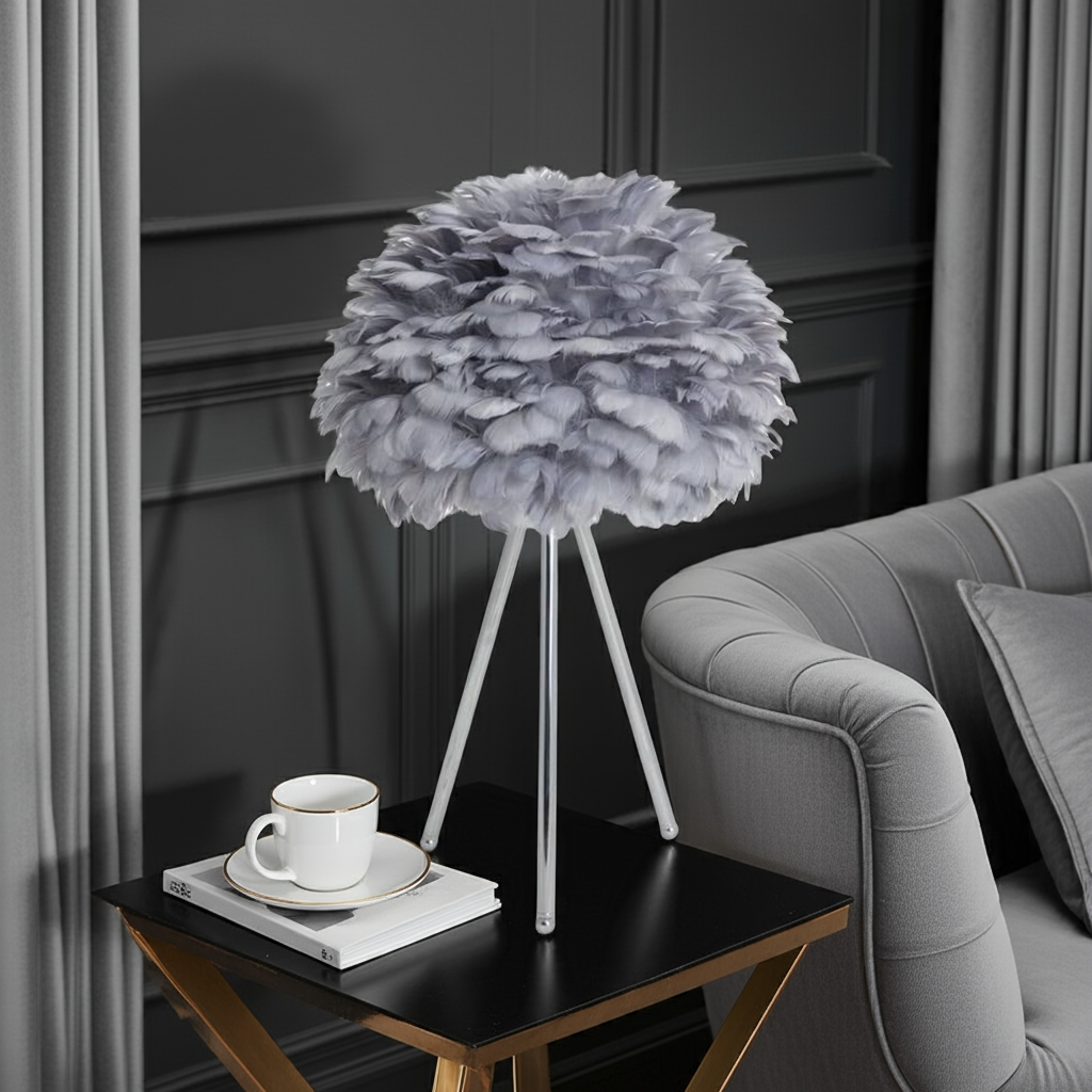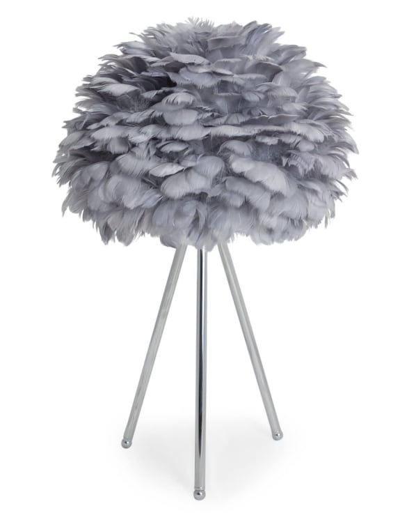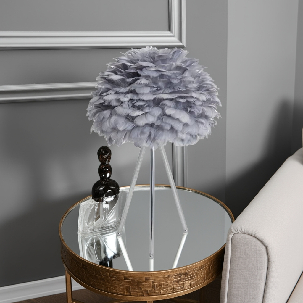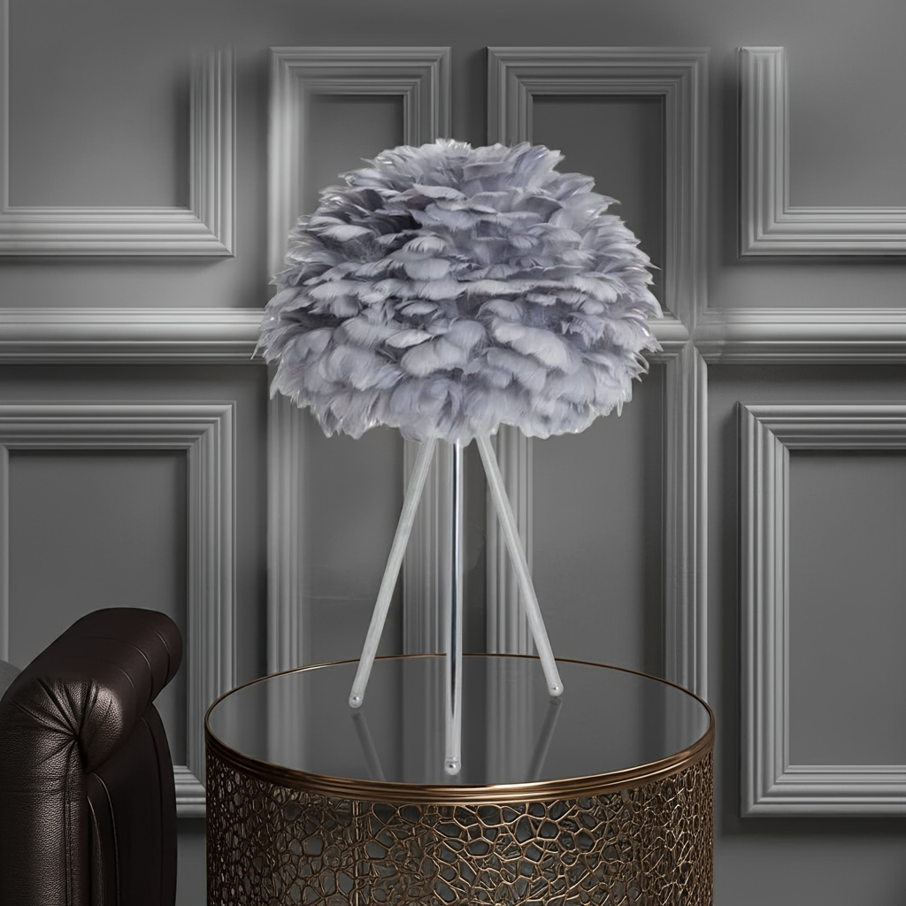 Elevate your interior with this Chrome Tripod Table Lamp featuring a distinctive grey feather shade. The sleek chrome tripod base offers stability and a modern aesthetic, while the soft feather shade diffuses light gently, creating a sophisticated ambiance. Ideal for adding a touch of contemporary elegance and subtle texture to any room.