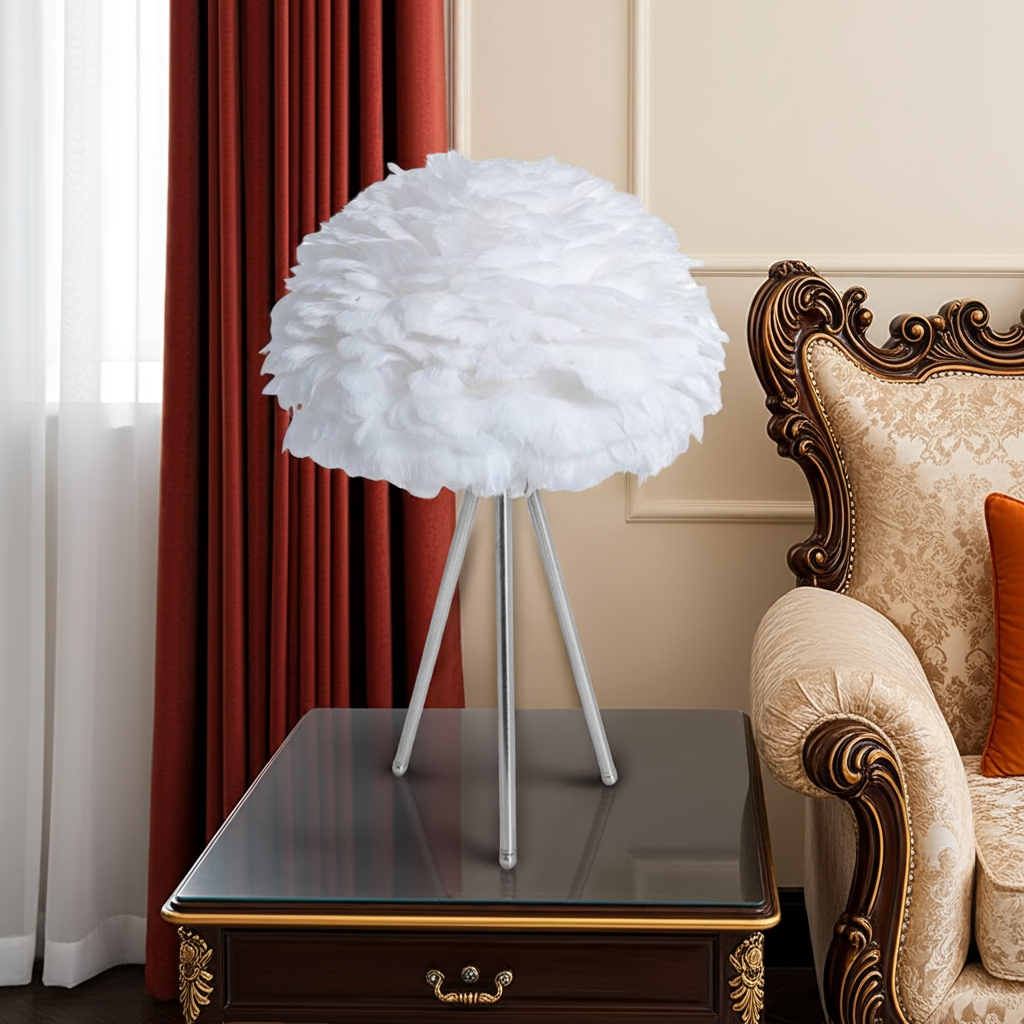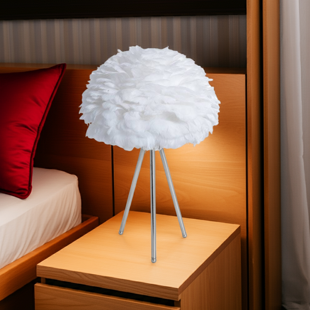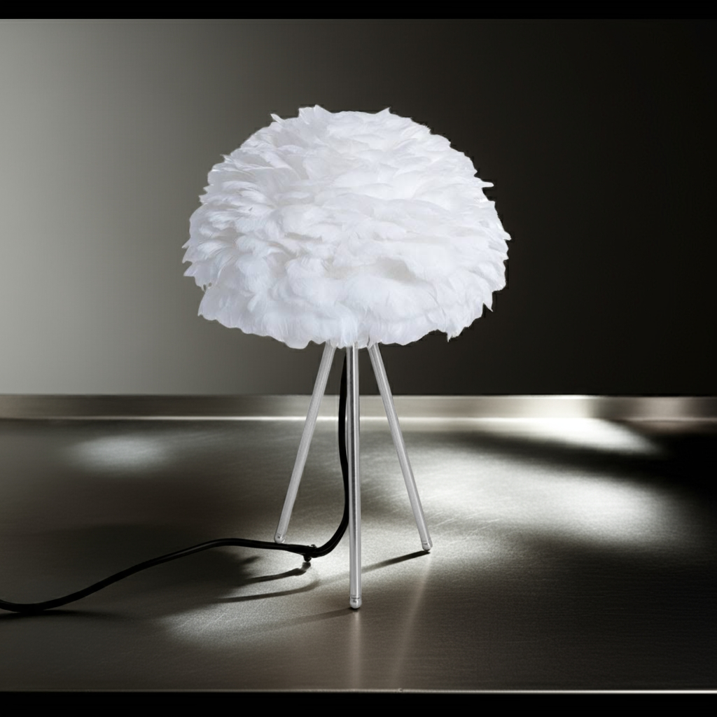 Elevate your interior with this Chrome Tripod Table Lamp featuring a distinctive white feather shade. Its sleek chrome tripod base offers stability and a modern aesthetic, while the feather shade diffuses light softly, creating a warm and inviting ambiance. Ideal for adding a sophisticated touch to living rooms, bedrooms, or offices, this lamp combines contemporary design with subtle texture for refined lighting.