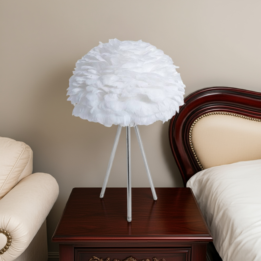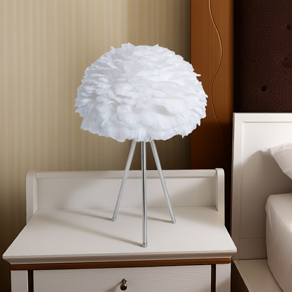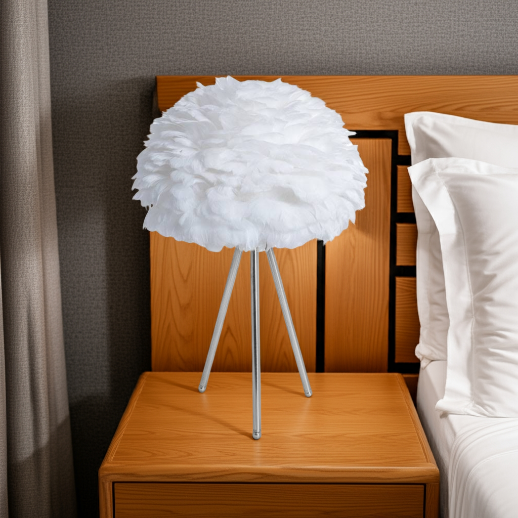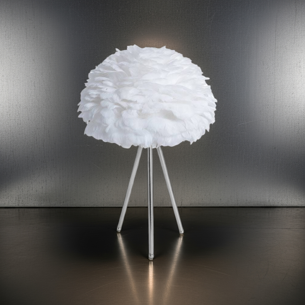 Elevate your interior with this Chrome Tripod Table Lamp featuring a distinctive white feather shade. Its sleek chrome tripod base offers stability and a modern aesthetic, while the feather shade diffuses light softly, creating a warm and inviting ambiance. Ideal for adding a sophisticated touch to living rooms, bedrooms, or offices, this lamp combines contemporary design with subtle texture for refined lighting.