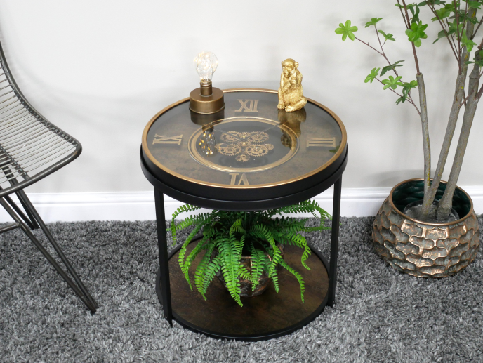 Transform your living space with this striking Clock With Cogs Side Table, a functional art piece that seamlessly blends timekeeping with contemporary design. Featuring authentic moving clock mechanisms integrated into its cog-adorned structure, this statement-making table serves as both practical furniture and captivating décor. The visible mechanical elements create dynamic visual interest, making it an ideal focal point for modern interiors. Powered by three AA batteries, it operates independently without requiring electrical outlets. Perfect for those seeking distinctive home furnishings that spark conversation and elevate any room's aesthetic appeal.