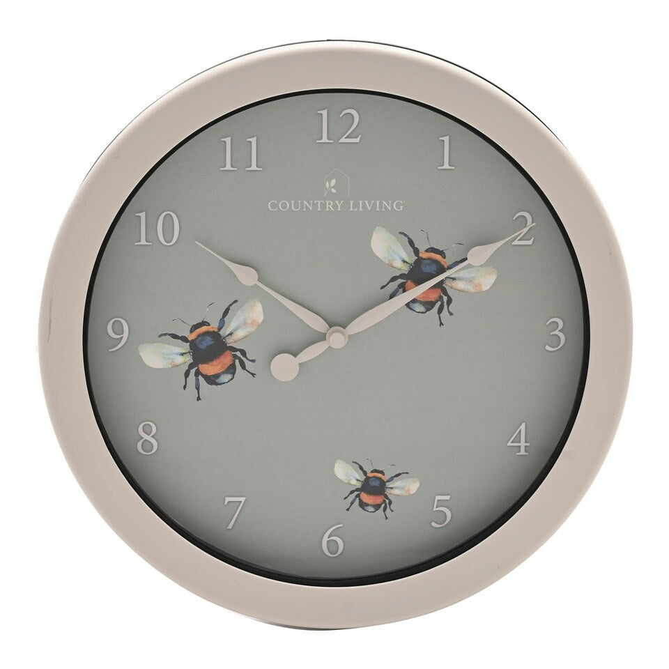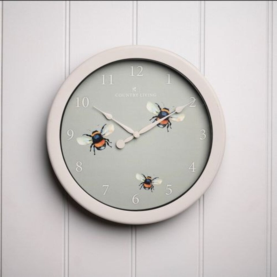 This Country Living Outdoor Clock beautifully captures the essence of nature with its vibrant bee-themed design. Featuring a green clock face adorned with detailed bee illustrations, it is set against a crisp white frame for clear visibility indoors or outdoors. The Arabic numerals and spade hands make time reading effortless, while its durable construction ensures it withstands outdoor conditions, bringing a charming, wildlife-inspired accent to any space. Perfect for nature enthusiasts seeking both functionality and aesthetic appeal.