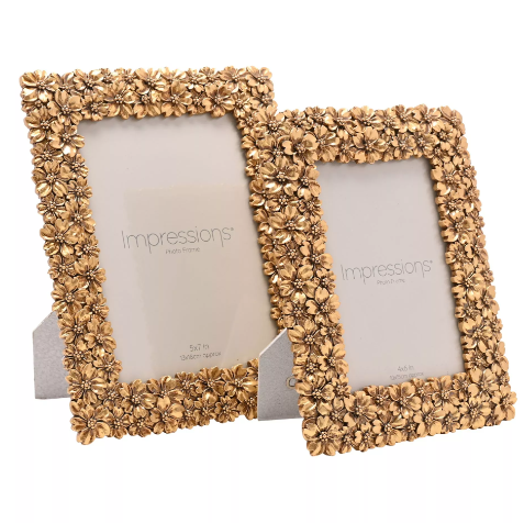 Adorn your cherished memories with the Impressions Flowers Design Resin Photo Frame 4" x 6", featuring gold floral patterns on a serene white backdrop. This exquisite frame adds elegance to any space, perfect for showcasing your favourite 4" x 6" photos. Designed with striking intricacies, it makes a delightful keepsake or gift, enhancing the charm of your captured moments. This frame is more than just a holder for your pictures; it's a statement piece. Why stop at one? Discover more enchanting pieces in the Impressions Flowers Design range and create your unique collection.