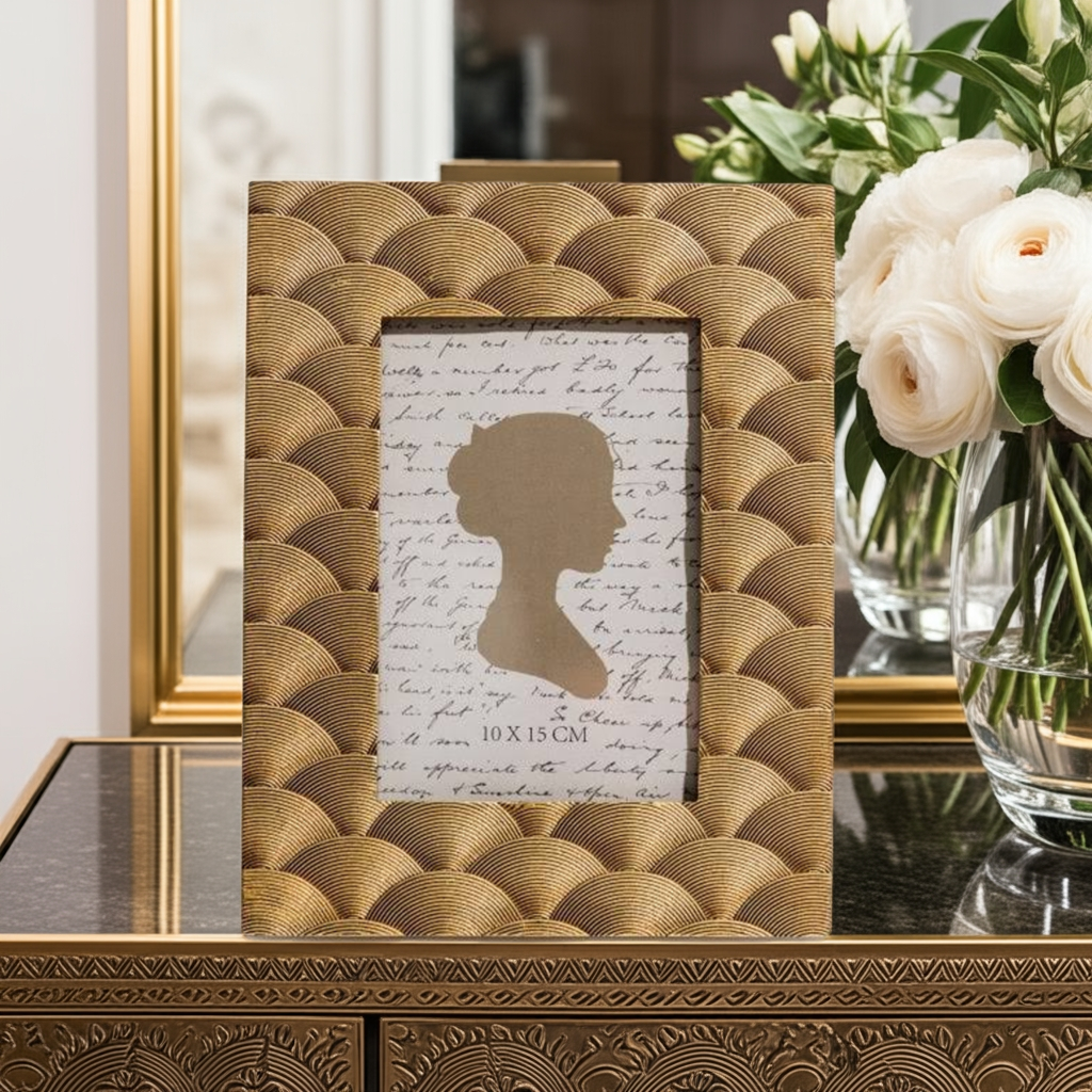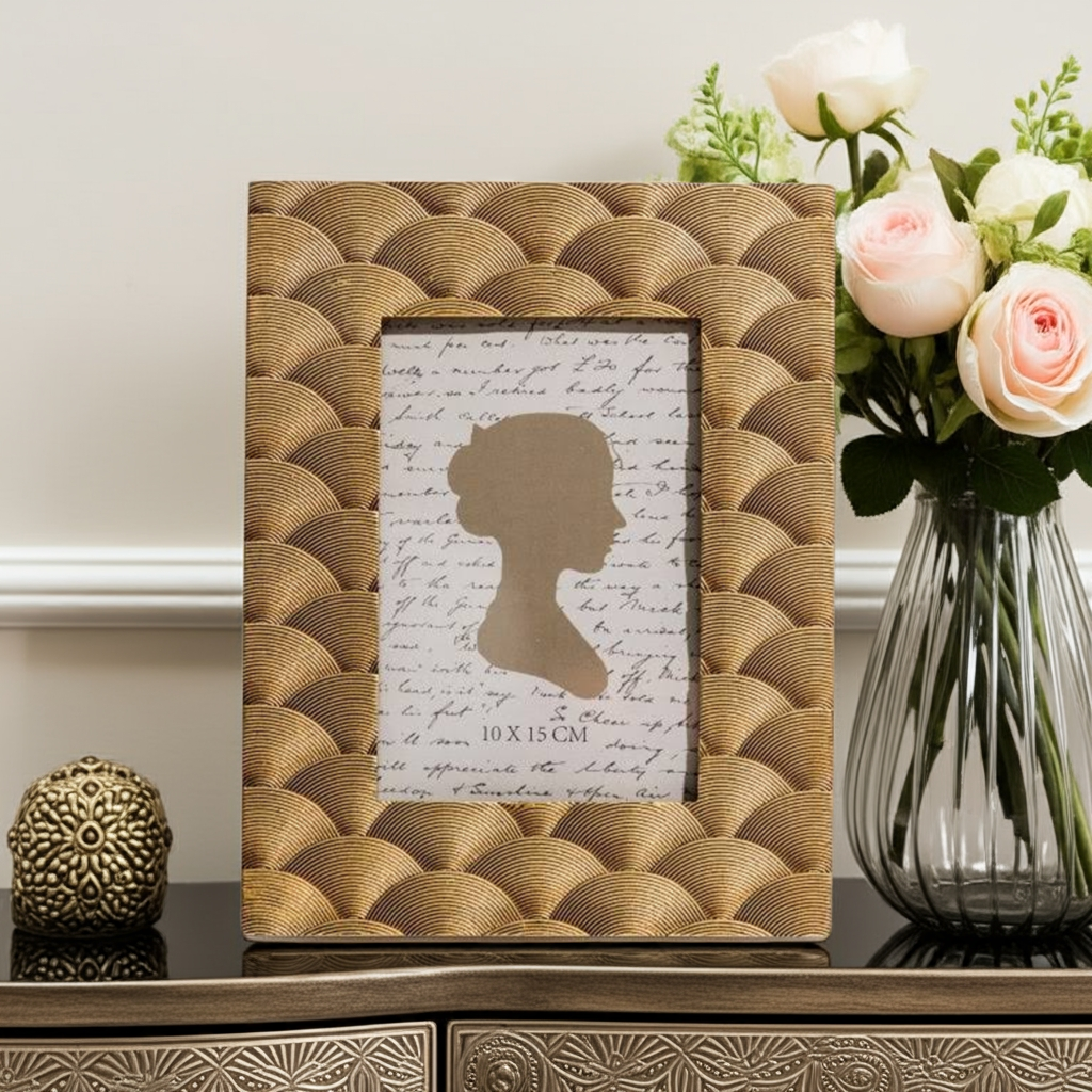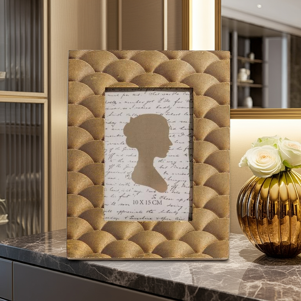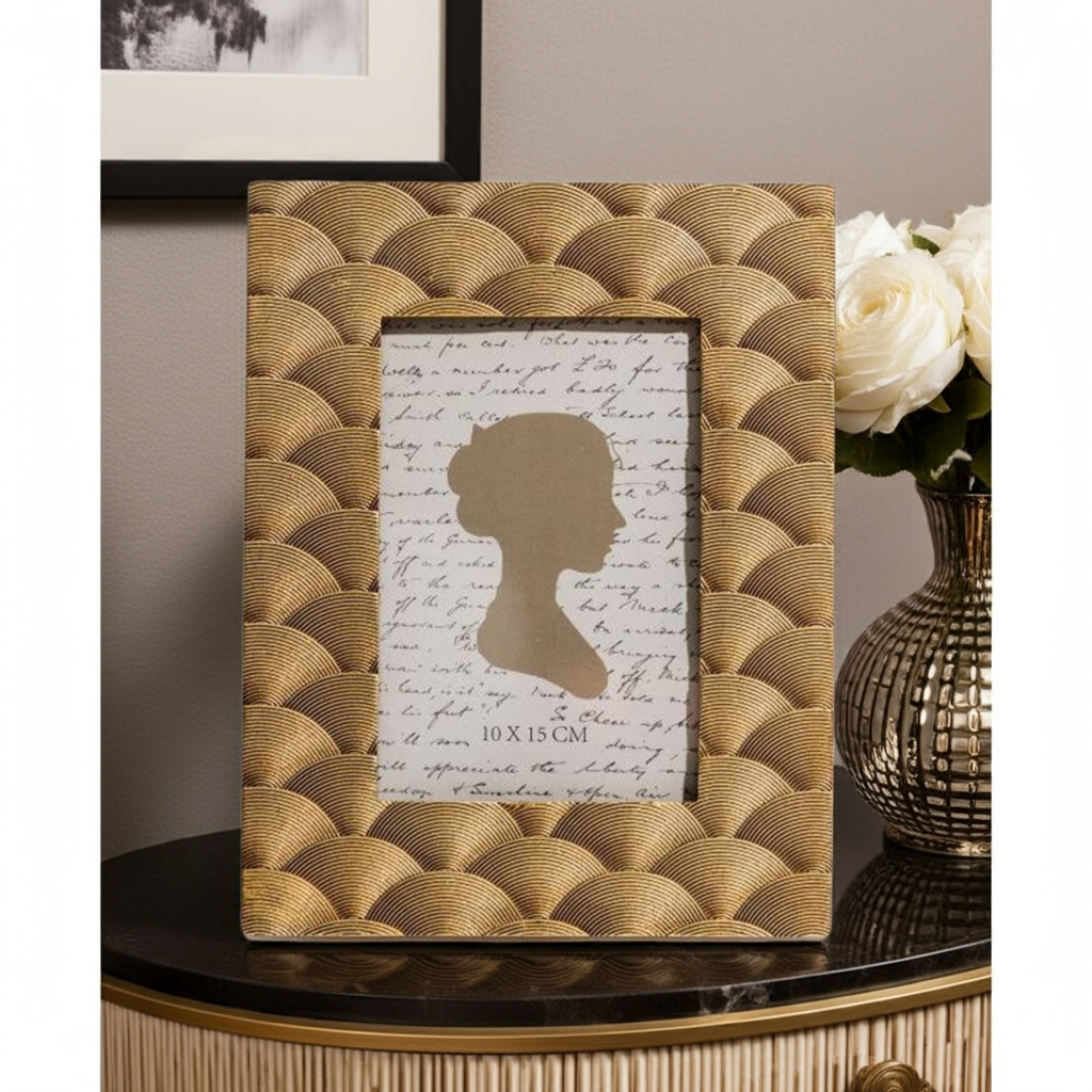 This elegant gold 5x7" photo frame adds a touch of sophistication to any room. The unique fan-effect design offers a modern twist on traditional frames, making it perfect for displaying your favorite memories. Crafted with high-quality materials, it is sure to showcase your photos beautifully for years to come.
