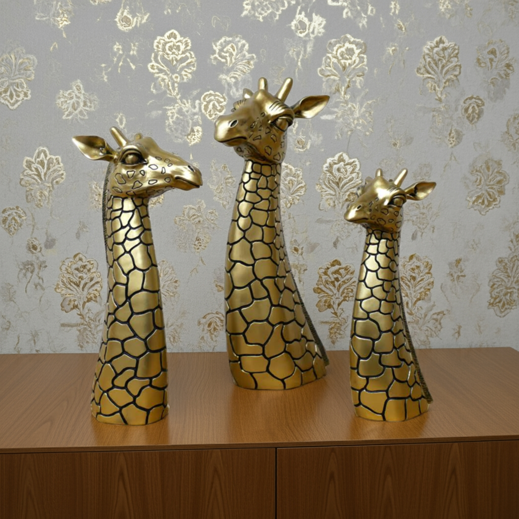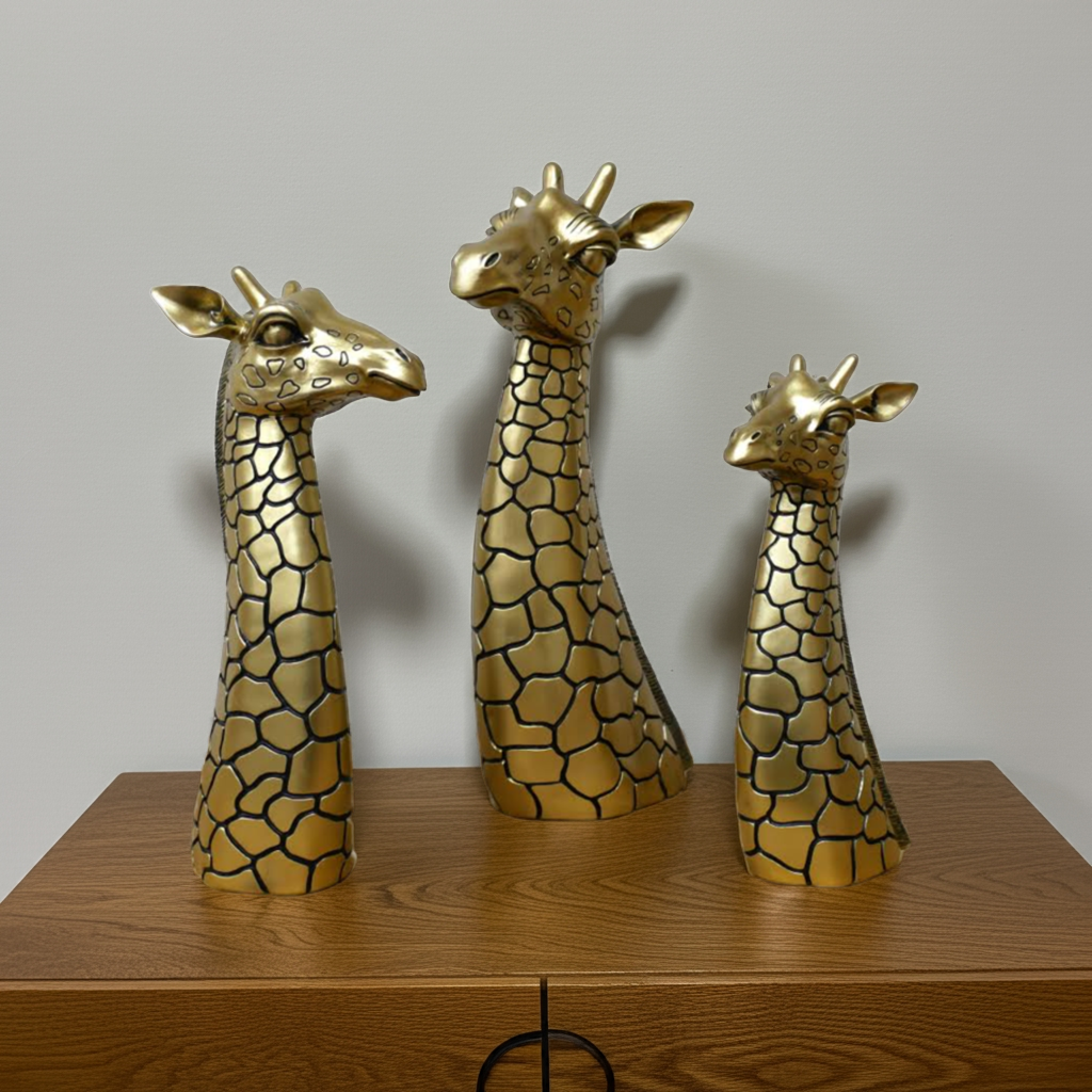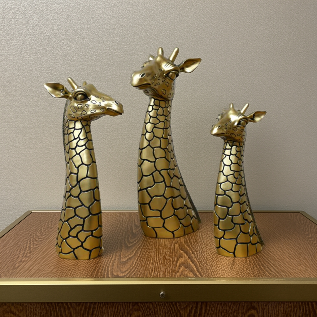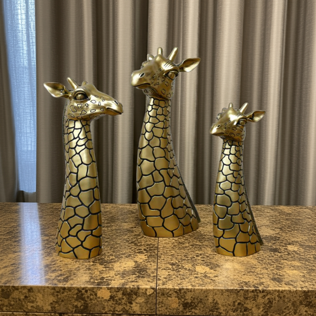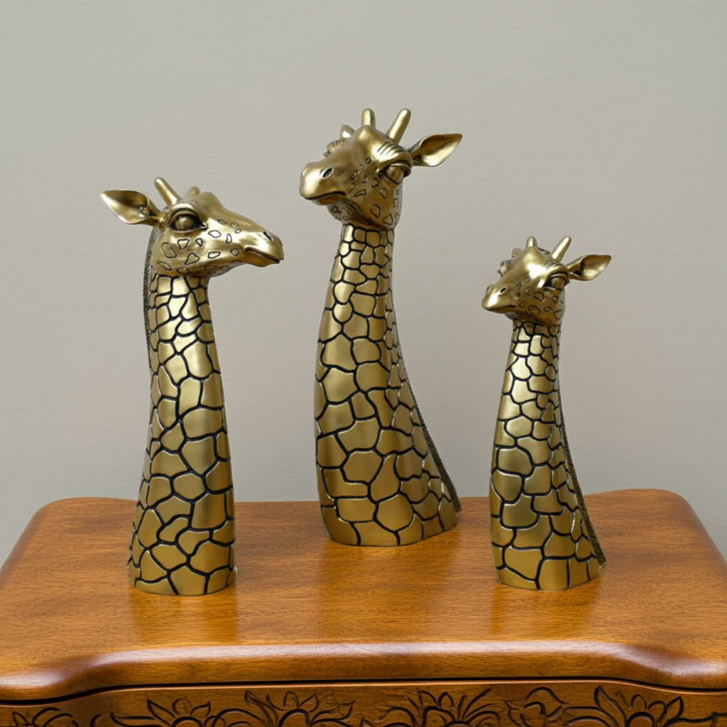 Expertly crafted and elegantly designed, our Antique Golden Giraffe Family Head Ornament/Sculpture adds a touch of sophistication to any space. Made with precision and attention to detail, this piece showcases the striking beauty and grace of a giraffe. Enhance your decor with this unique and timeless treasure.