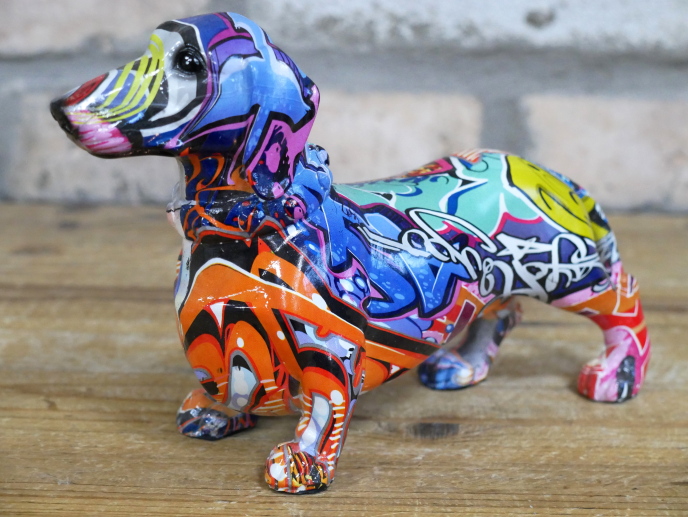Celebrate your love for dachshunds with this striking Graffiti Sausage Dog Ornament. Expertly crafted from durable resin, this vibrant piece features bold, street-art inspired colors that bring personality to any space. Perfect for dog enthusiasts seeking unique décor, it makes an ideal gift for fellow sausage dog admirers or a charming addition to your own collection. Whether displayed year-round or hung as a festive ornament, this eye-catching design captures the playful spirit of man's best friend with contemporary flair.