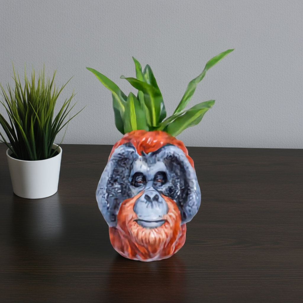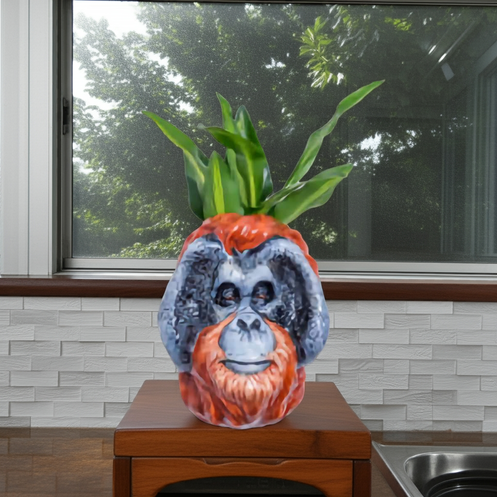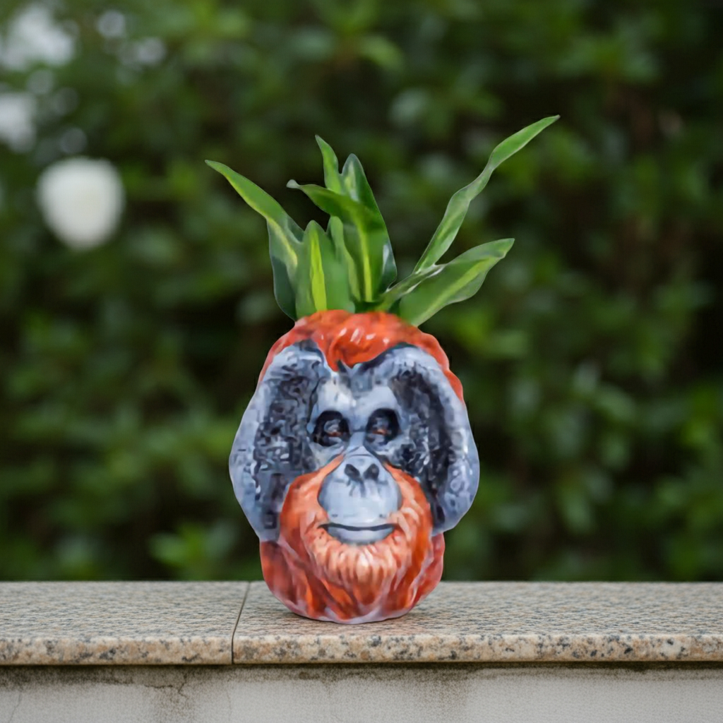 This hand-painted ceramic orangutan head storage jar/vase is a unique and expertly crafted piece. Perfect for storing small items or displaying flowers, this jar/vase adds a touch of art and functionality to any room or kitchen as well as indoor and outdoor too. Made with high quality materials and painted with intricate details by skilled artists.