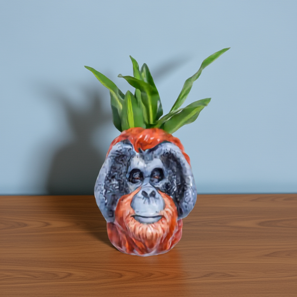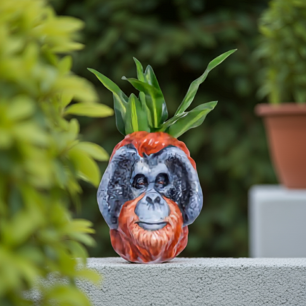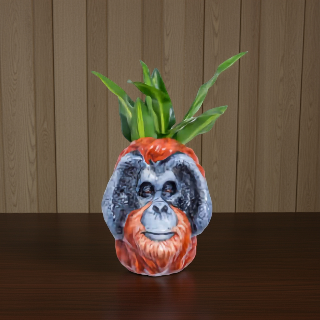This hand-painted ceramic orangutan head storage jar/vase is a unique and expertly crafted piece. Perfect for storing small items or displaying flowers, this jar/vase adds a touch of art and functionality to any room or kitchen as well as indoor and outdoor too. Made with high quality materials and painted with intricate details by skilled artists.