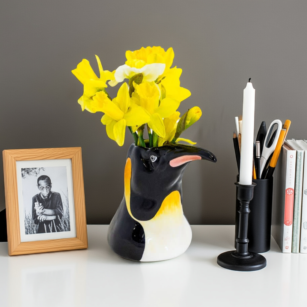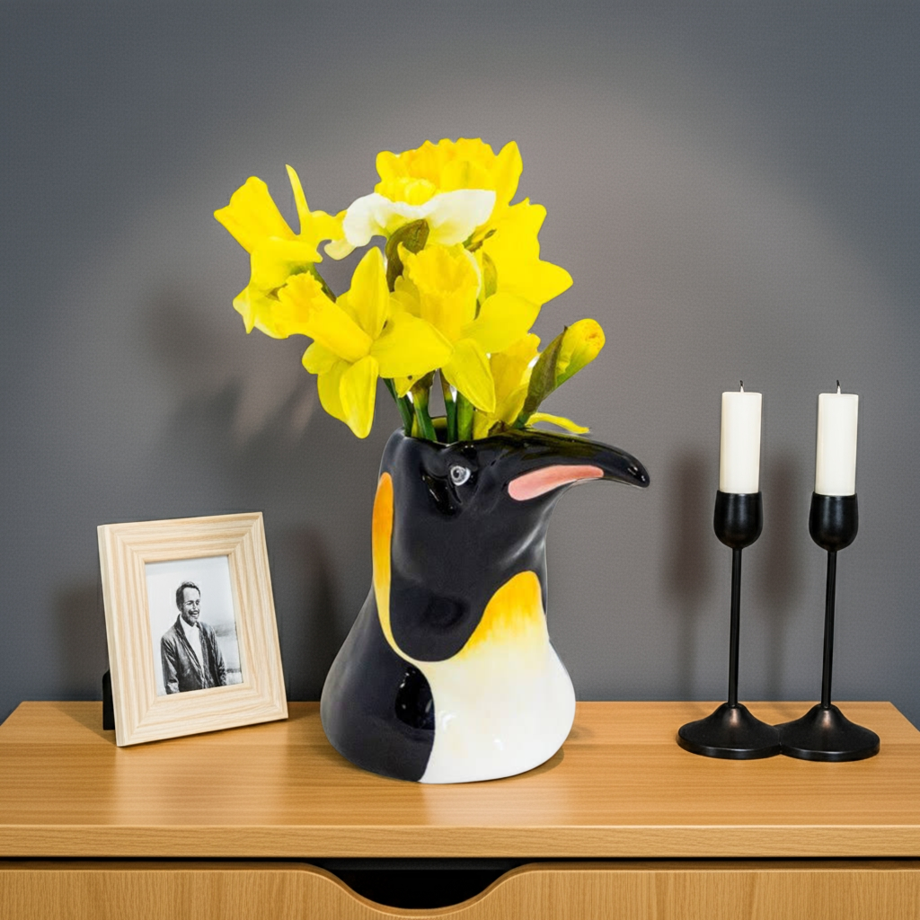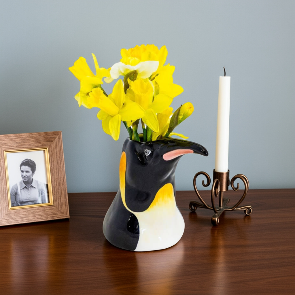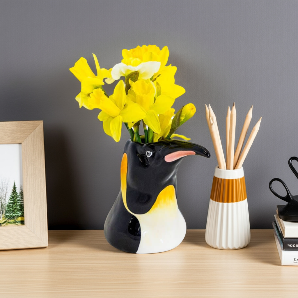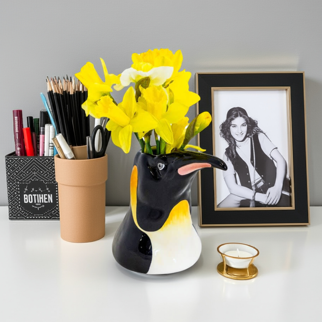 This beautiful hand-painted ceramic penguin head storage jar/flower vase adds a unique touch to any space. Crafted with intricate details and vibrant colors, it serves as both a functional storage solution and a stunning piece of decor. Made with high-quality materials, it is a durable and stylish addition to your home.