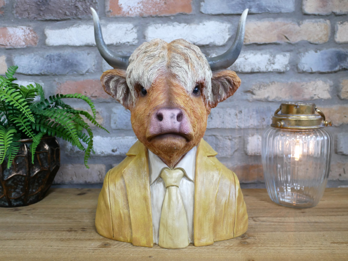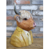 This Large Highland Cow Dressed Up Bust Ornament is expertly crafted from durable resin, ensuring longevity and detail. Its distinctive design captures the character of the Highland cow, making it an exceptional decorative piece. Ideal for enthusiasts or those seeking a unique statement, it complements any interior space with rustic charm and personality.