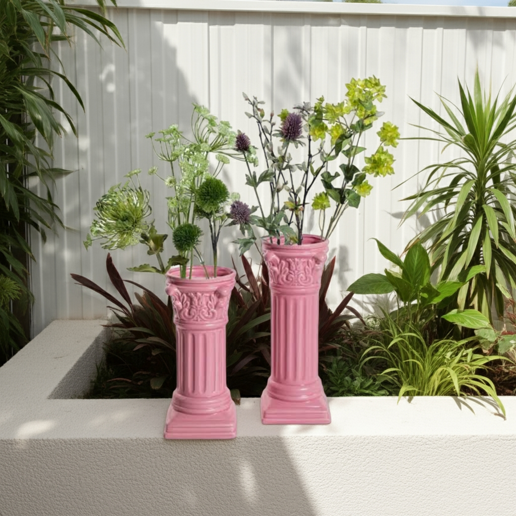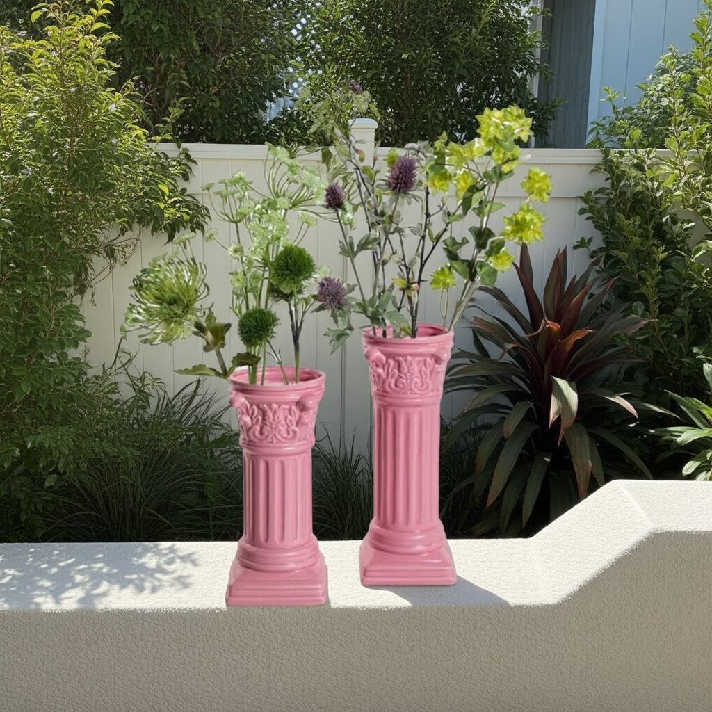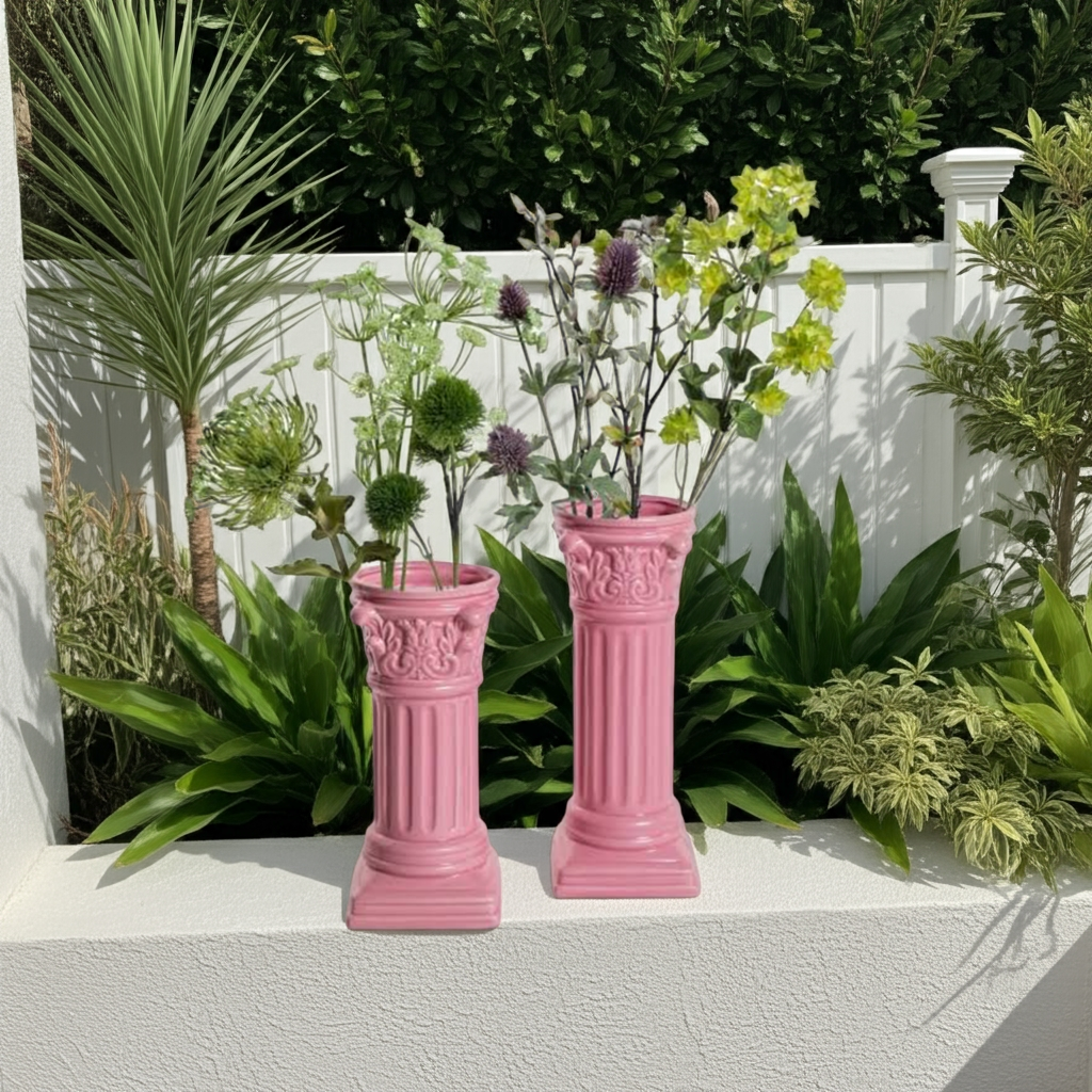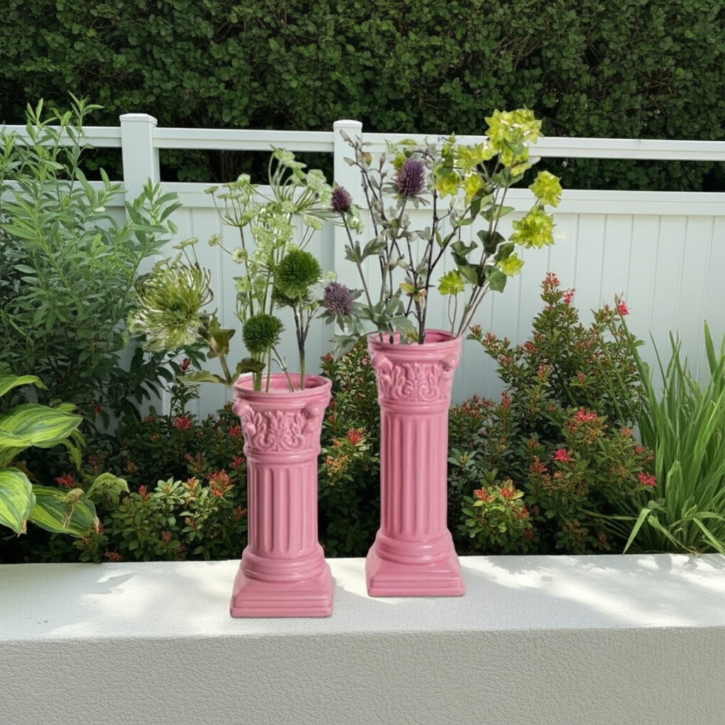 Expertly crafted, this Corinthian column vase boasts a stunningly bright pink color that will make a statement in any indoor or outdoor space attractive. Made with high quality ceramic, this vase exudes elegance and durability. A must-have for any home or garden decor enthusiast.