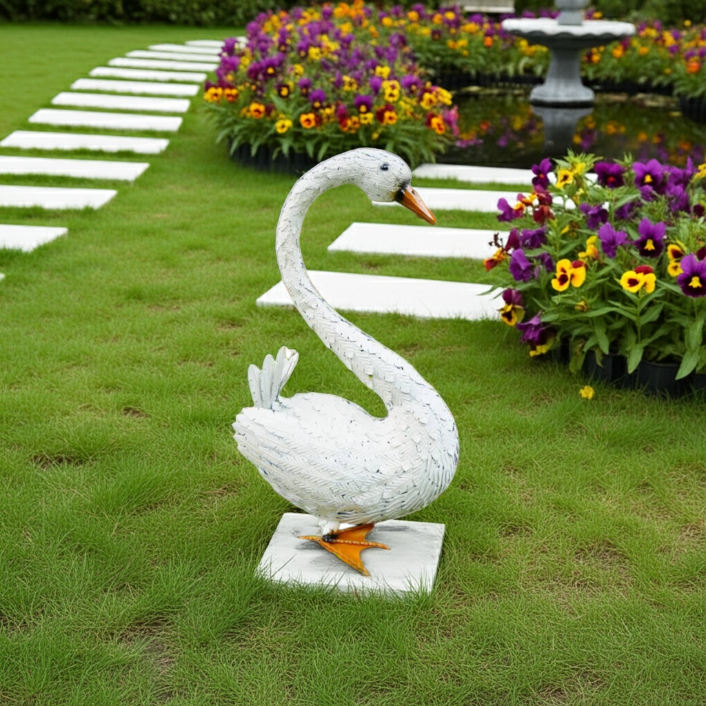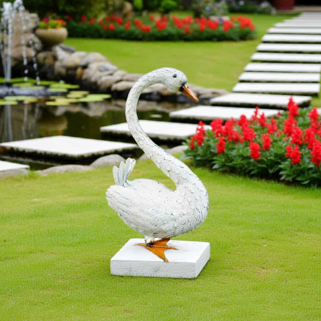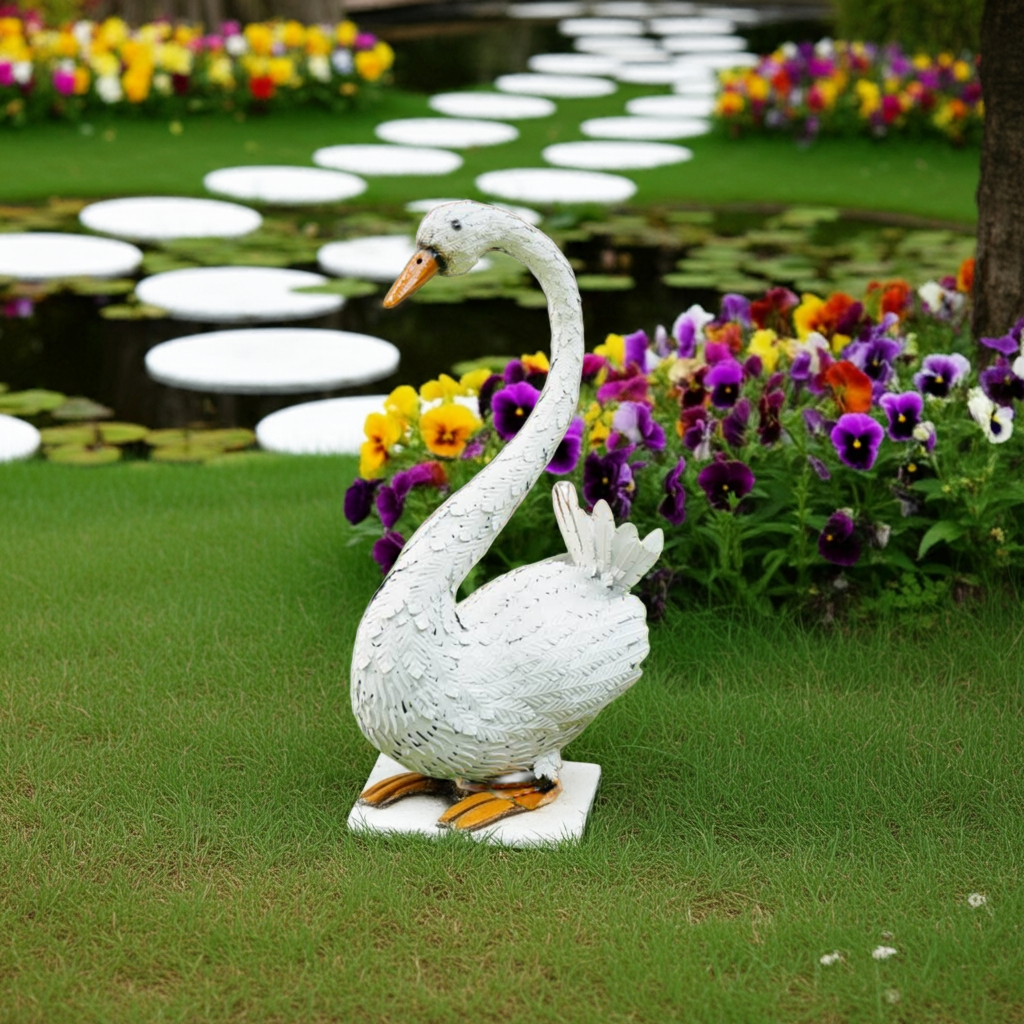This large white metal sitting swan garden ornament is a stunning addition to any indoor or outdoor decor. Made from high-quality metal, it is durable and perfect for adding a touch of elegance to your patio. Transform your space with this beautiful piece that adds both beauty and charm.