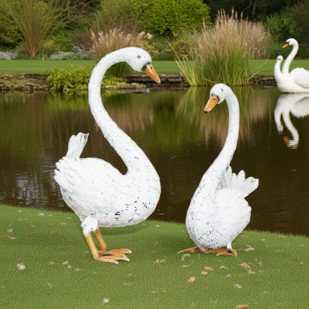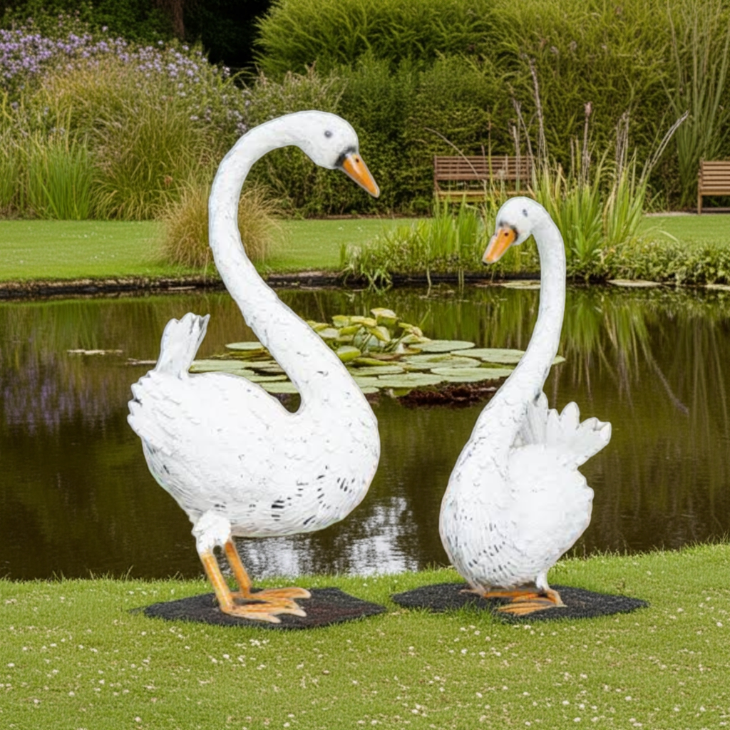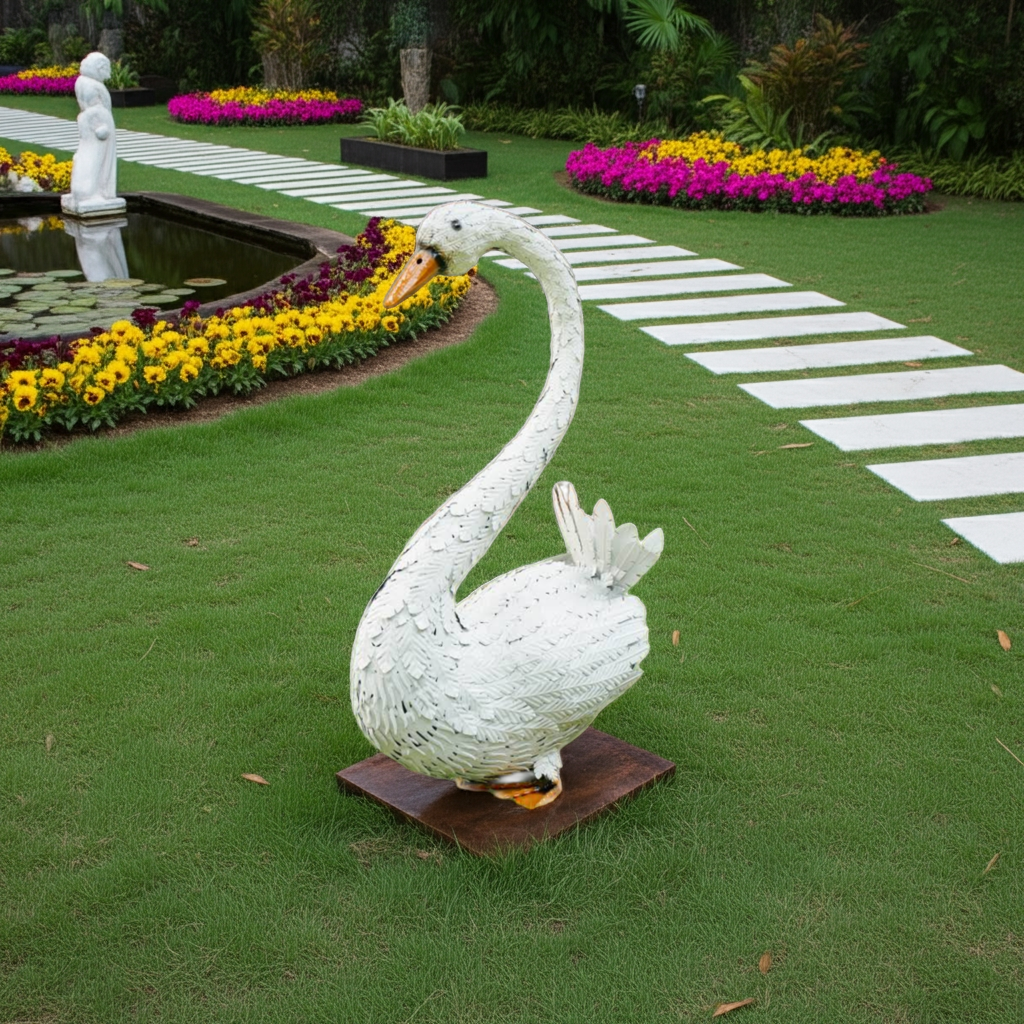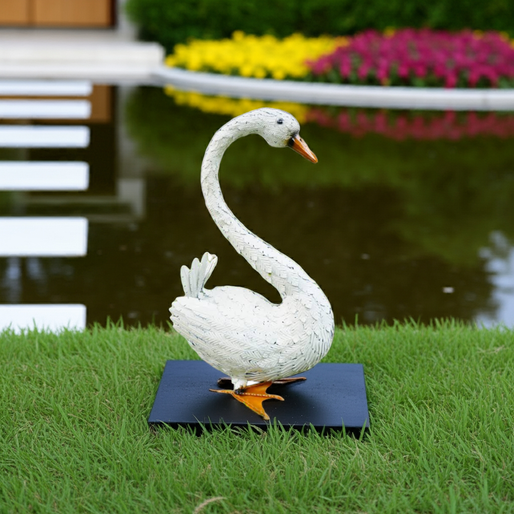 This large white metal sitting swan garden ornament is a stunning addition to any indoor or outdoor decor. Made from high-quality metal, it is durable and perfect for adding a touch of elegance to your patio. Transform your space with this beautiful piece that adds both beauty and charm.