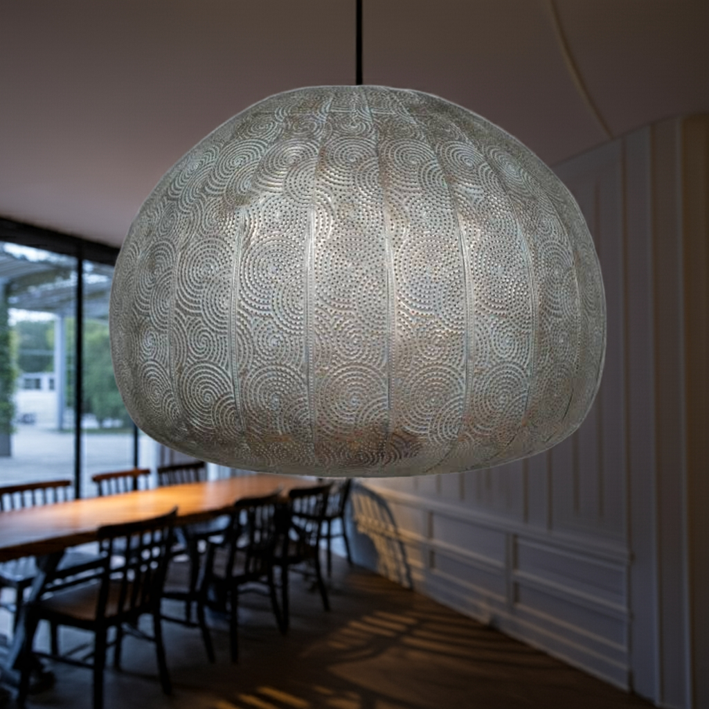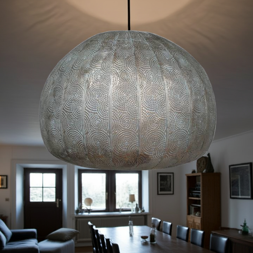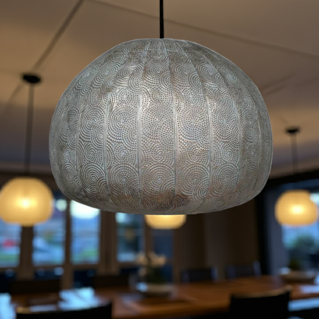 This elegant Ball Shape Metal Pendant Light Shade is an eye-catching addition to any room. Crafted out of a noble and graceful metallic silver design, its spherical lampshade features decorative punching's that reflect the light beautifully. Add a touch of luxury and elegance to your home.