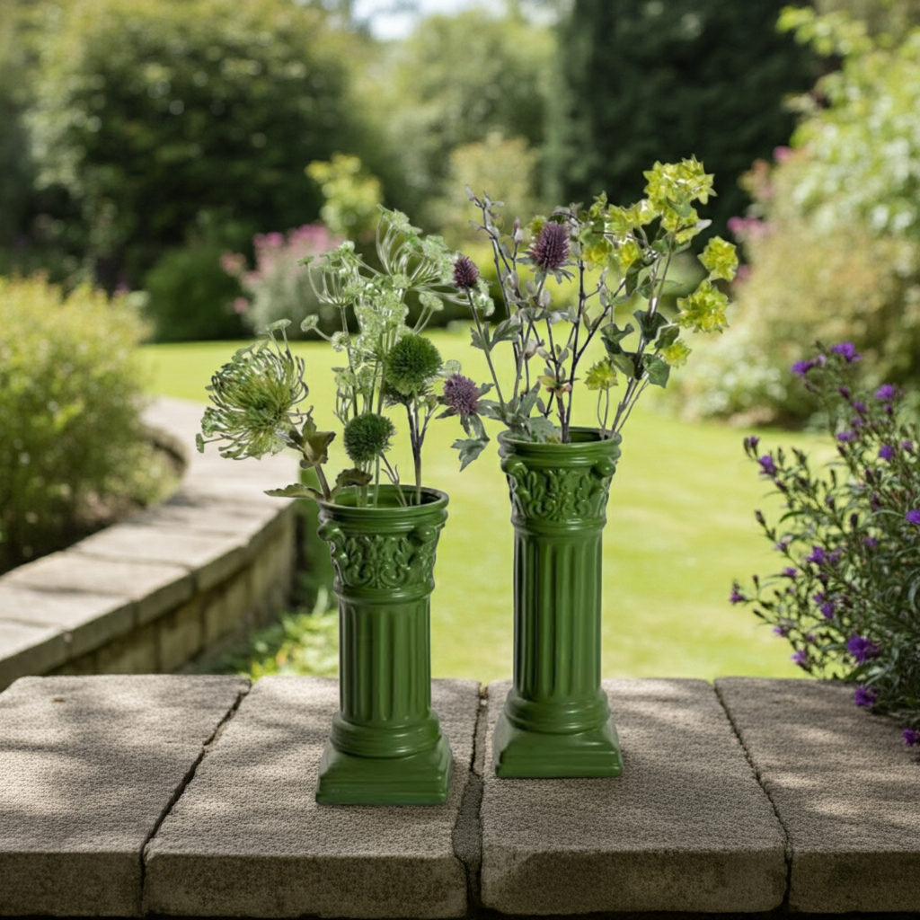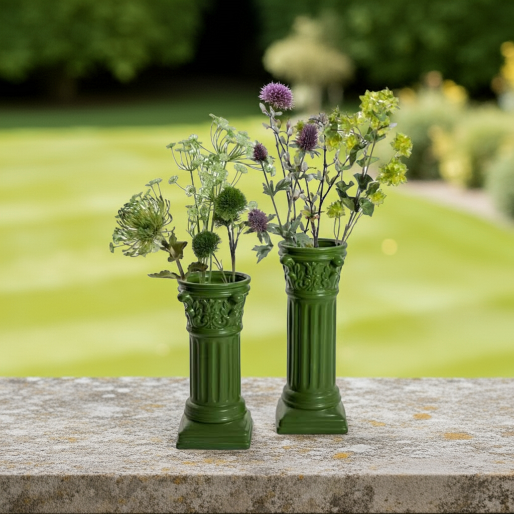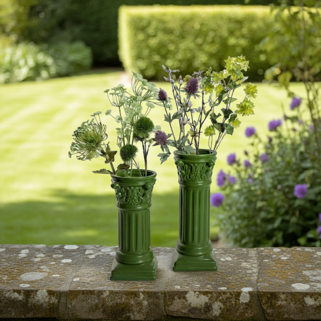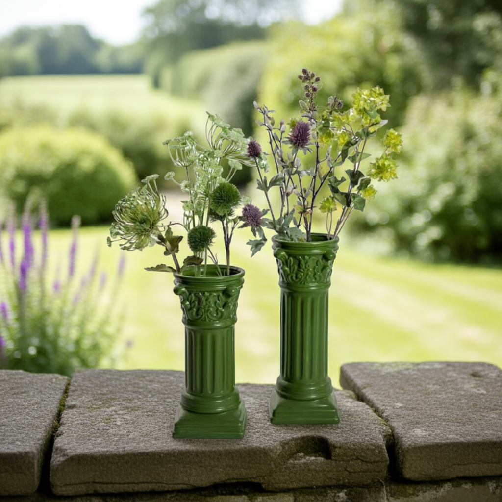 This small dark green Corinthian column ceramic vase is perfect for both indoor and outdoor use. Its sleek design and durable material make it a versatile and stylish addition to any space. Enhance your home decor with the elegance and functionality of this beautiful vase.