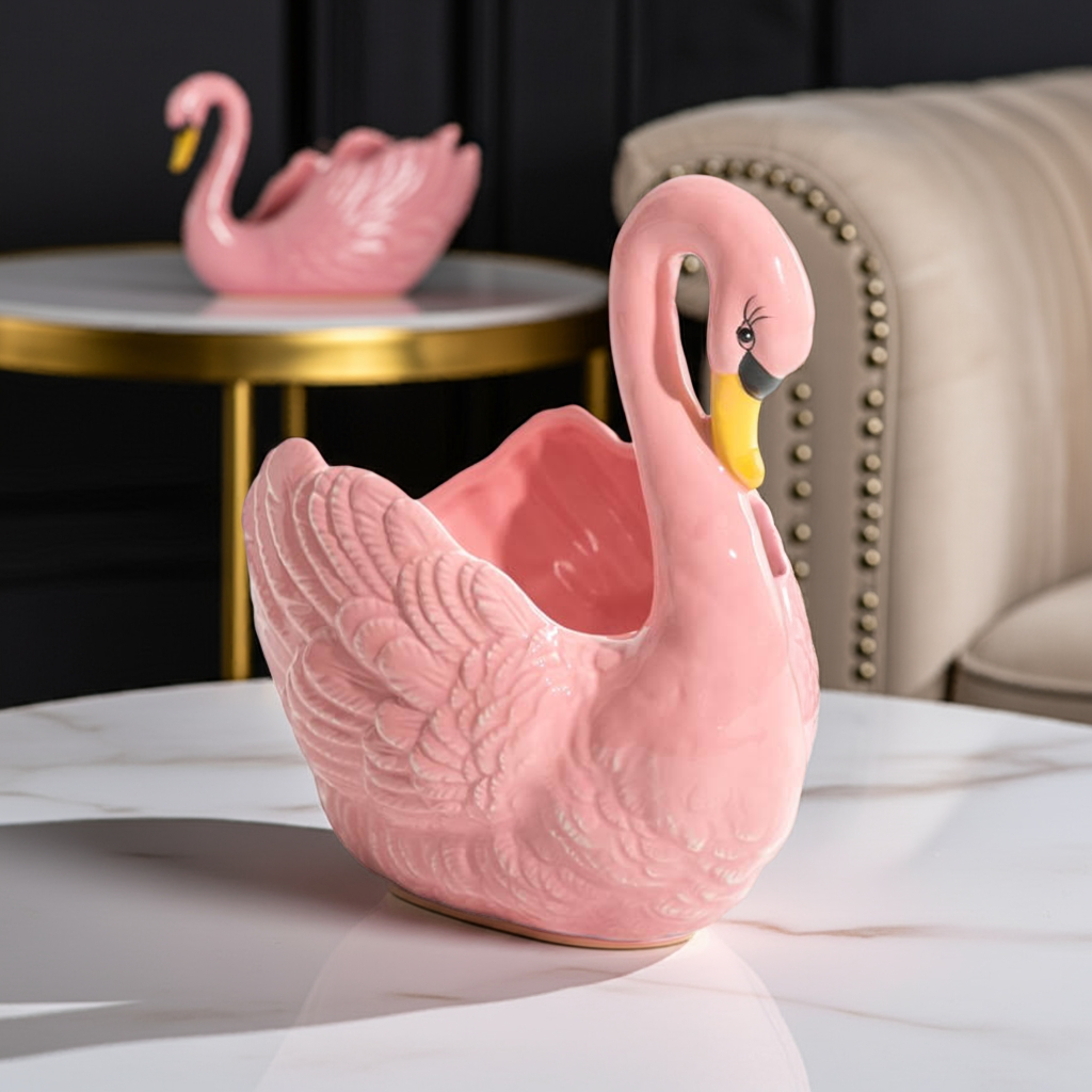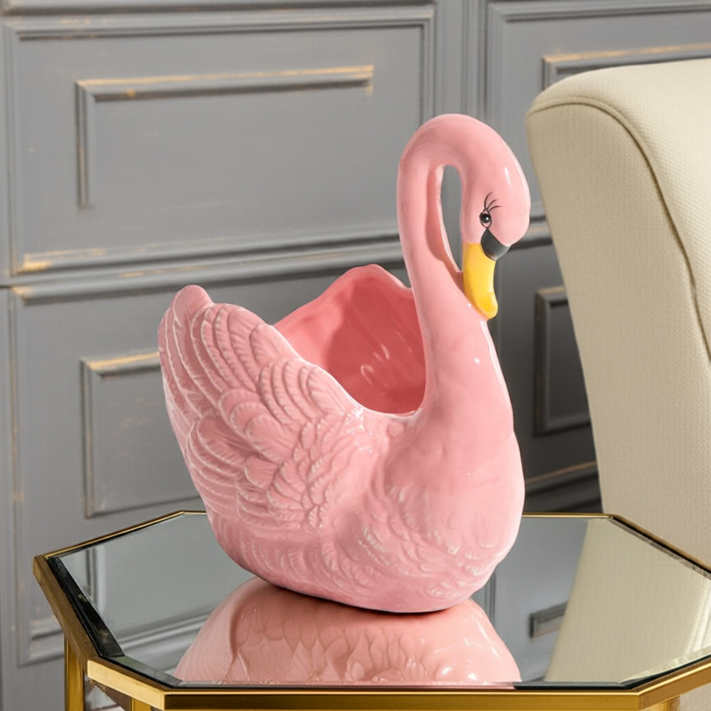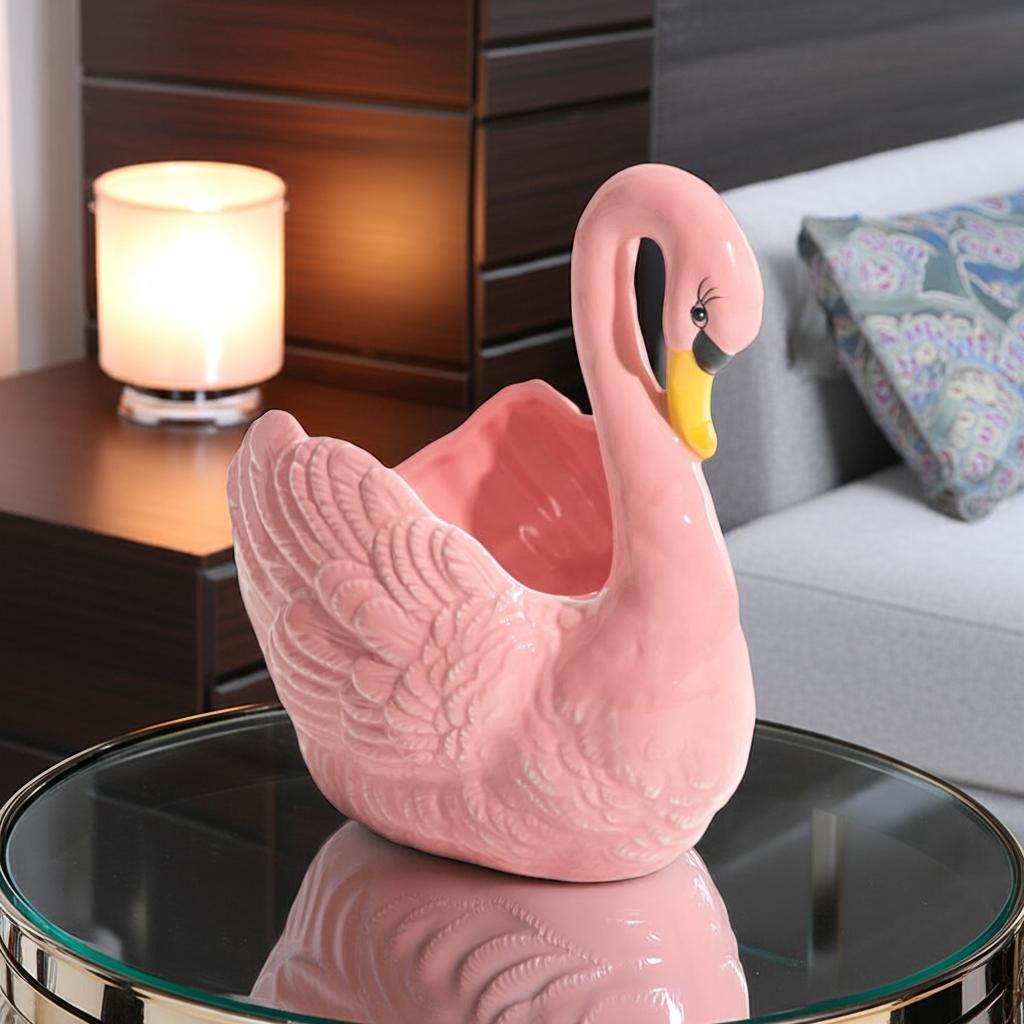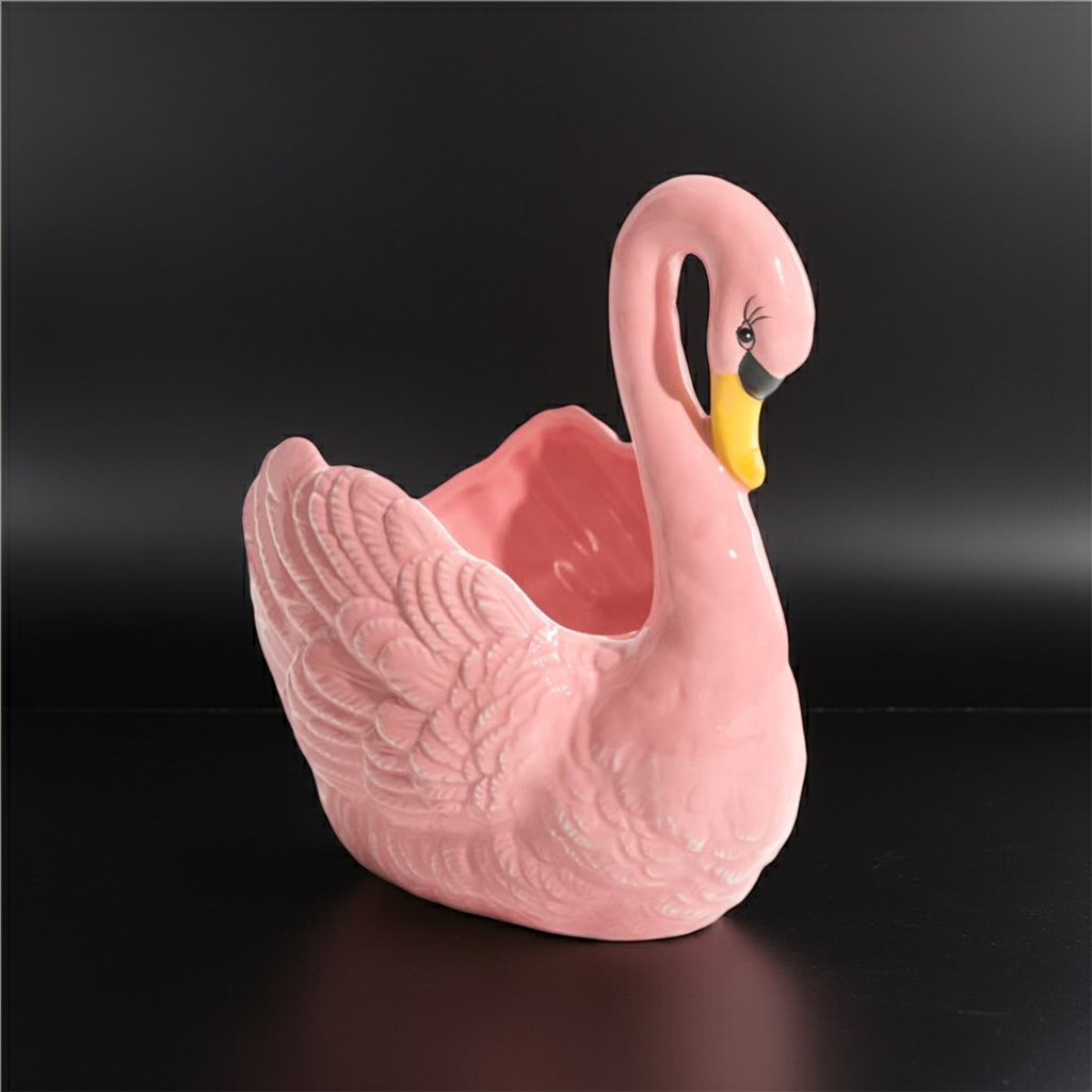 This multi-functional pink swan ceramic planter doubles as a stylish storage bowl. Made with high-quality materials, it adds a touch of elegance to any room. Perfect for showcasing your favorite plants or organizing small items in a chic way. Upgrade your home decor with this versatile piece.