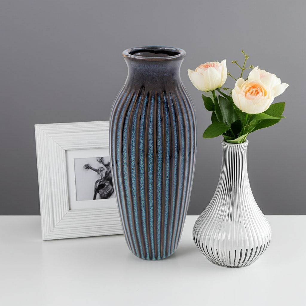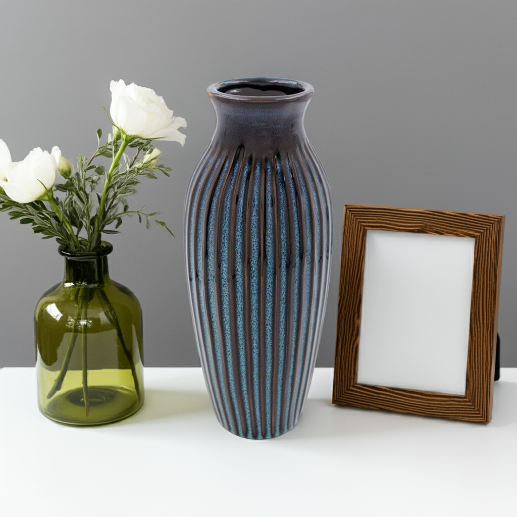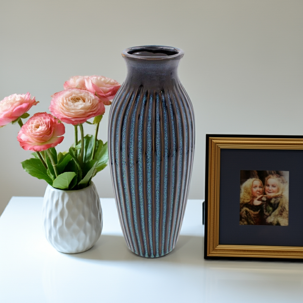 Elevate your indoor decor with the meticulously crafted Reactive Glaze Vase Blue. This 26cm vase boasts the latest techniques in its design, making it a stunning and unique piece for any room decor. Perfect for display in a reception area or even as a statement piece in your outdoor space like patio or garden decor.