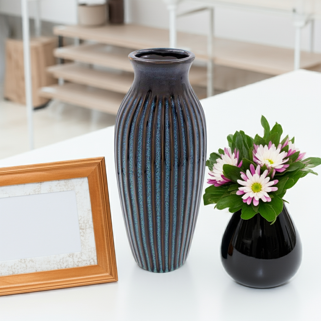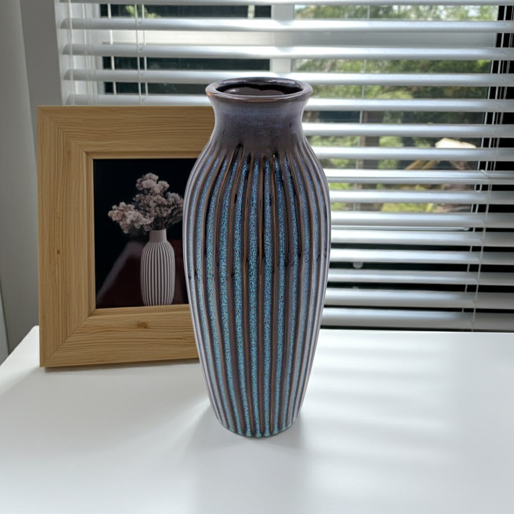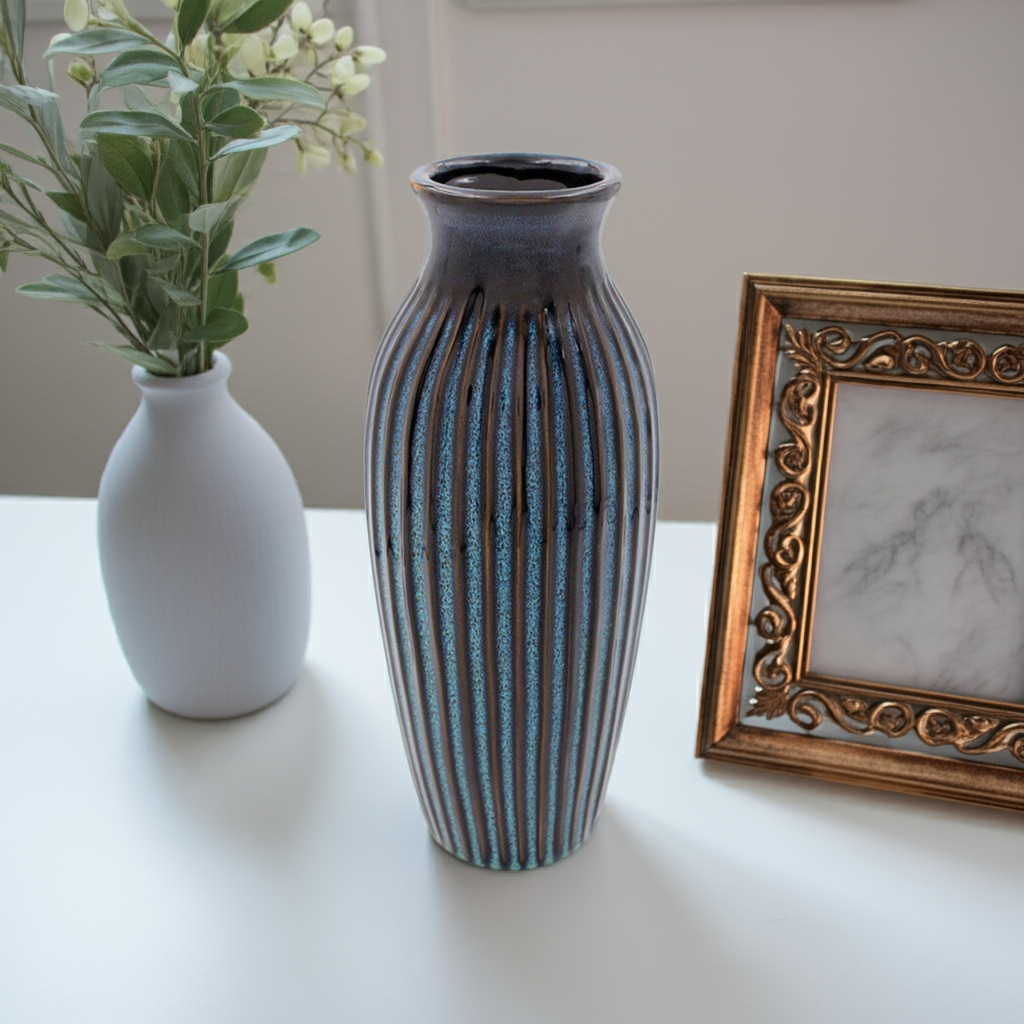 Elevate your indoor decor with the meticulously crafted Reactive Glaze Vase Blue. This 26cm vase boasts the latest techniques in its design, making it a stunning and unique piece for any room decor. Perfect for display in a reception area or even as a statement piece in your outdoor space like patio or garden decor.