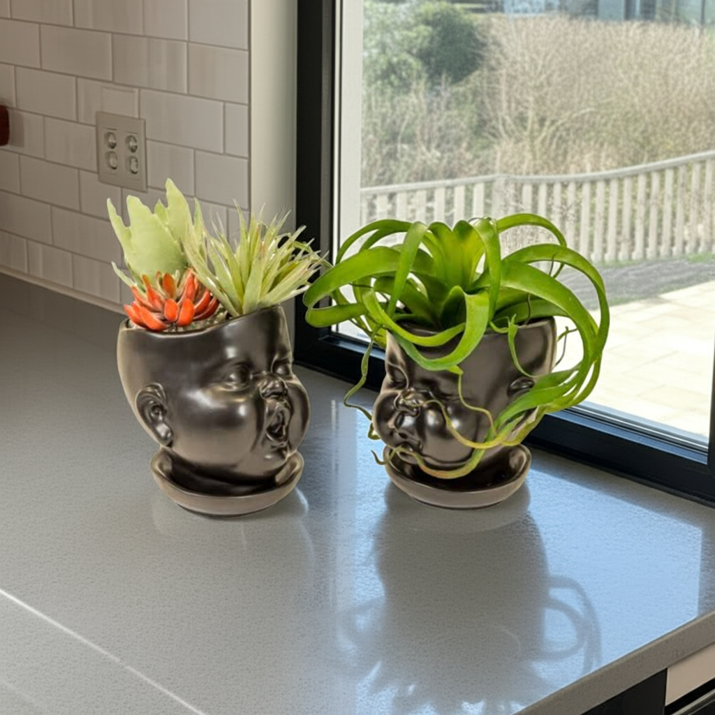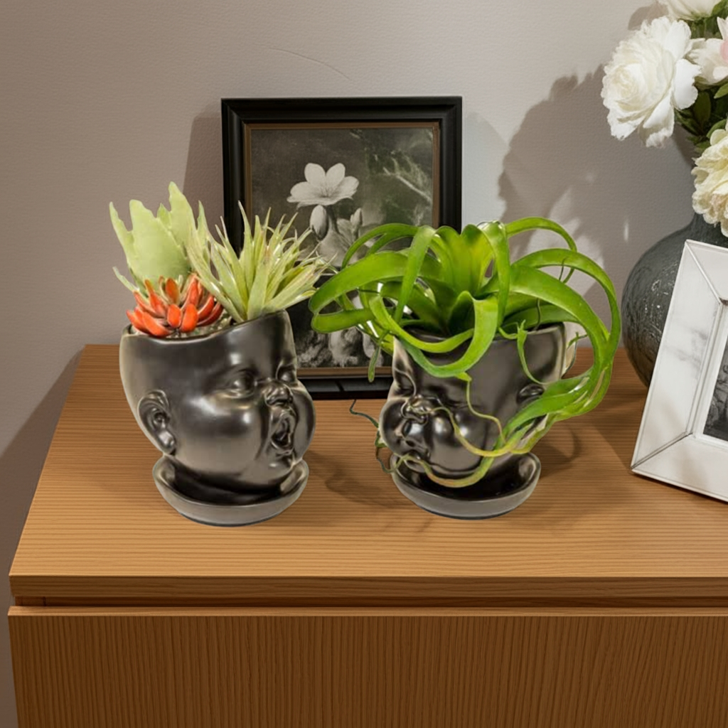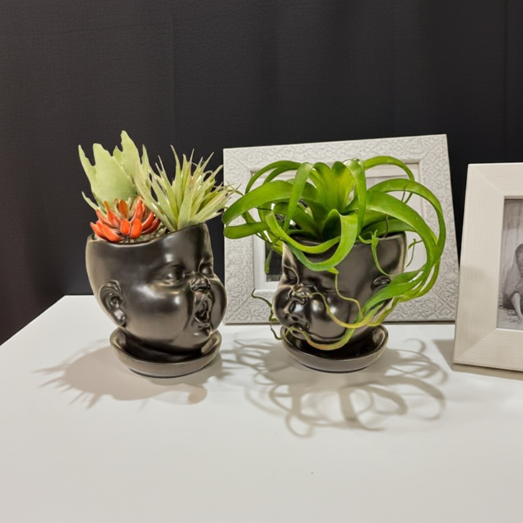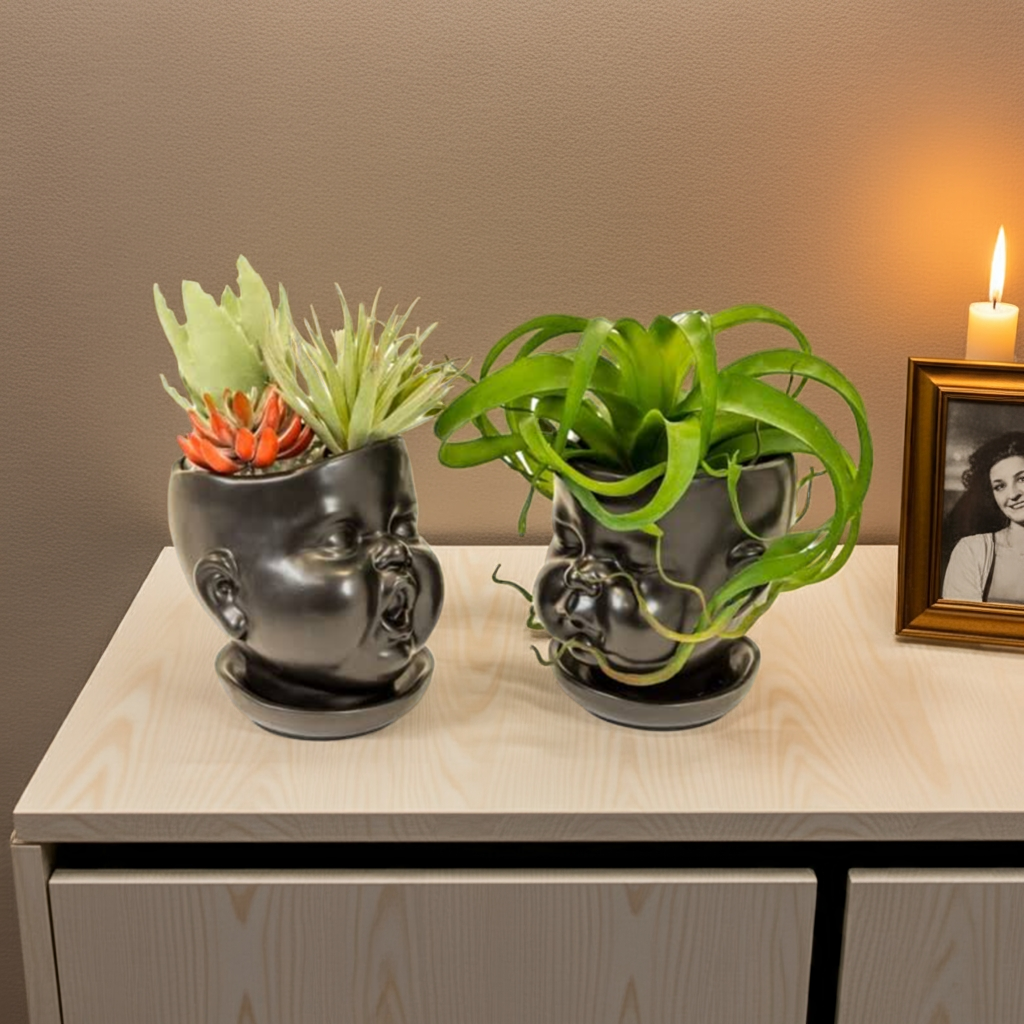 These adorable black ceramic baby face pots / vase are the perfect addition to any nursery or home decor. Made from high-quality ceramic, they add a touch of charm and whimsy to any space. Use them as vases for flowers or small plants, or simply display them as decorative pieces. With their playful baby face design, they are sure to add a delightful touch to any room.
