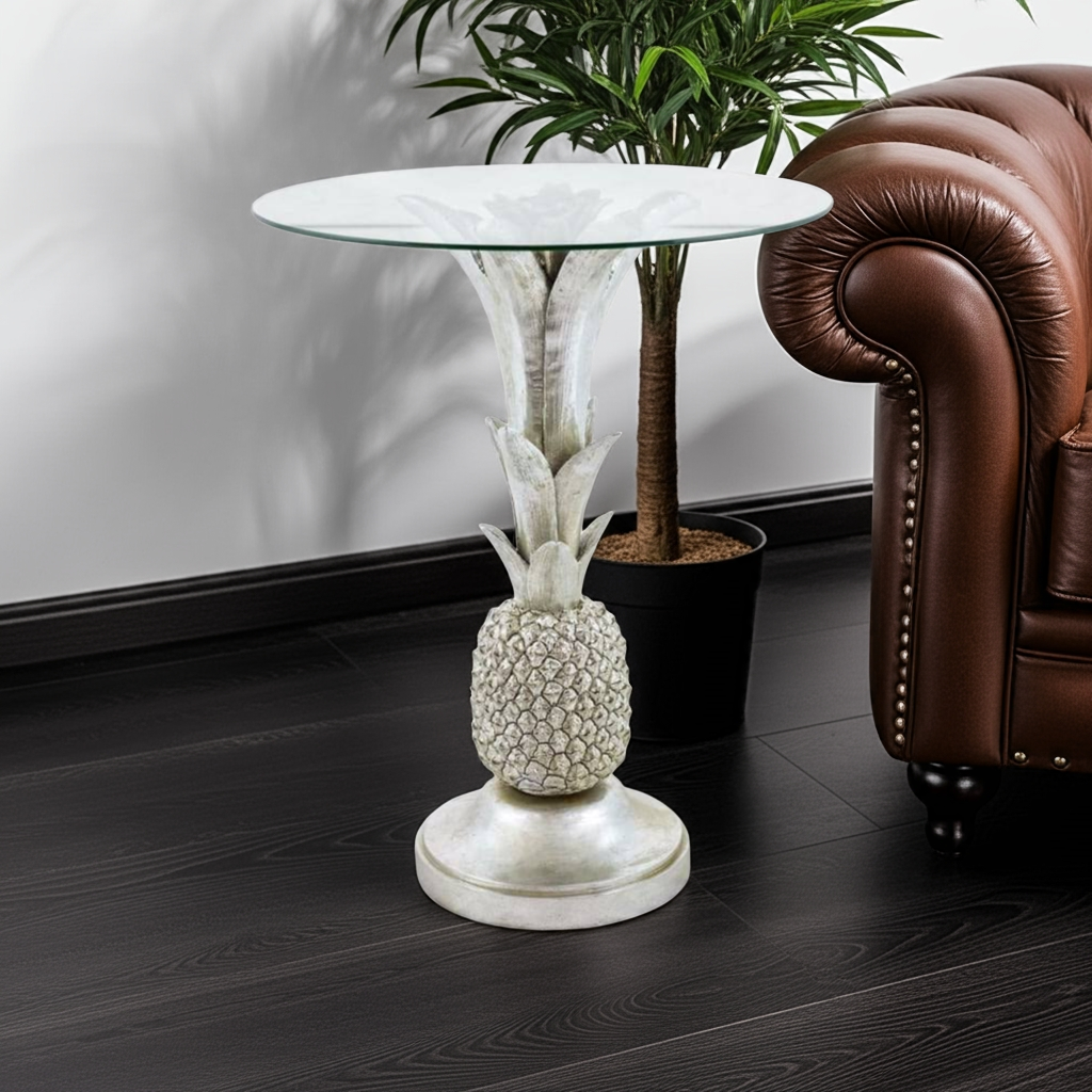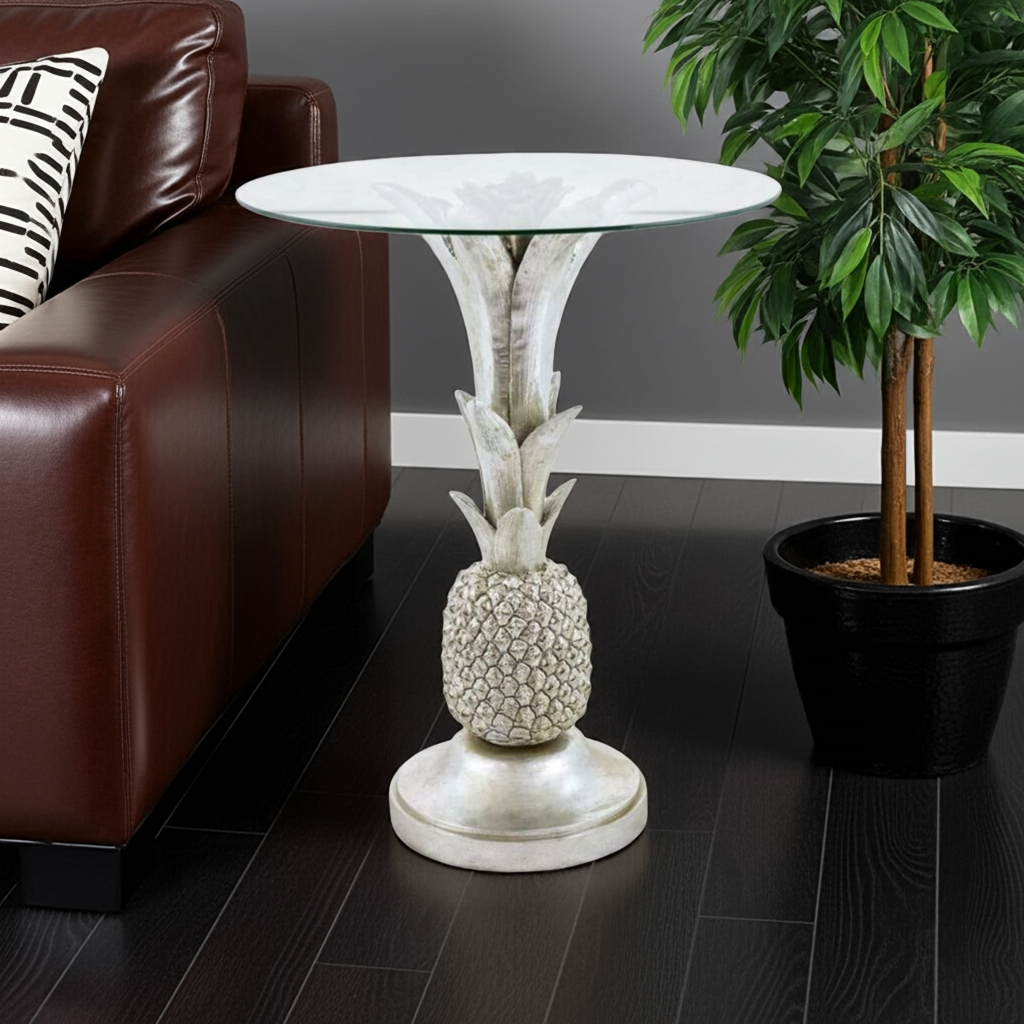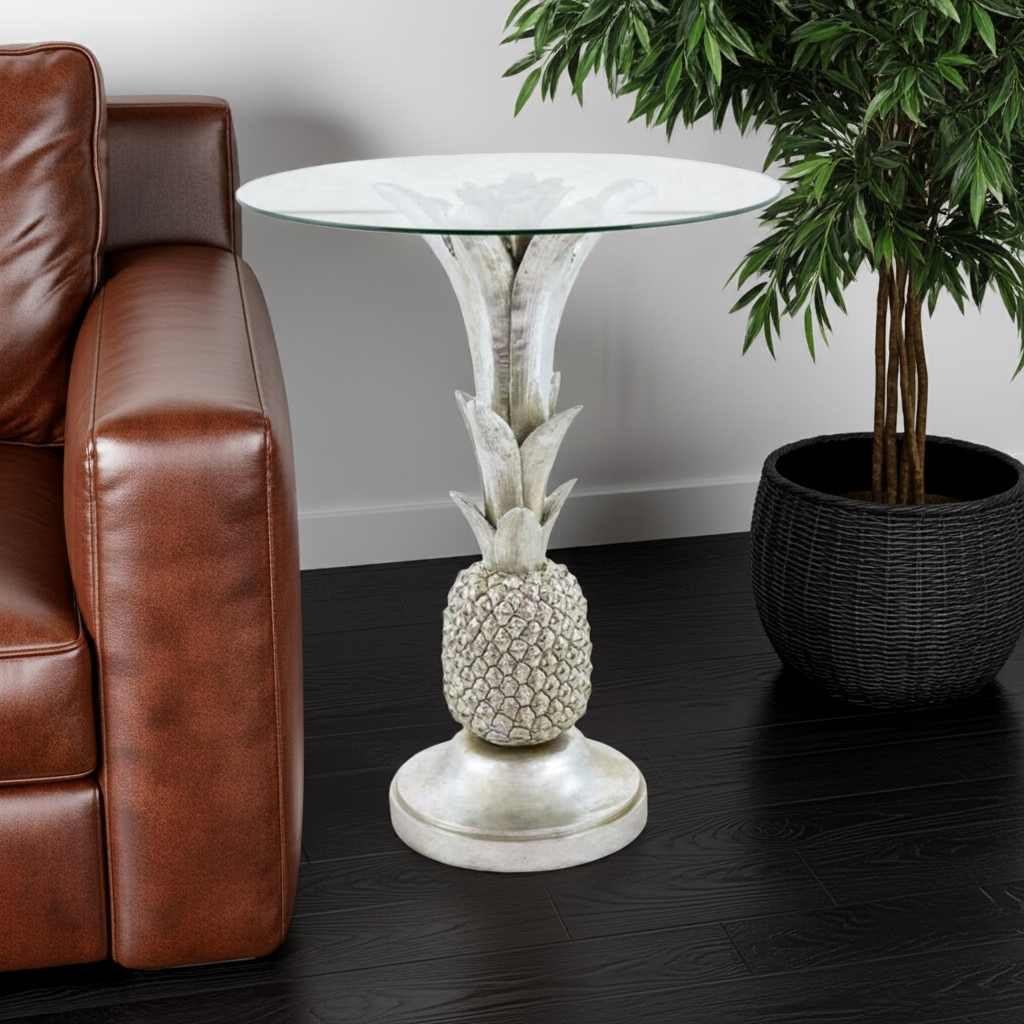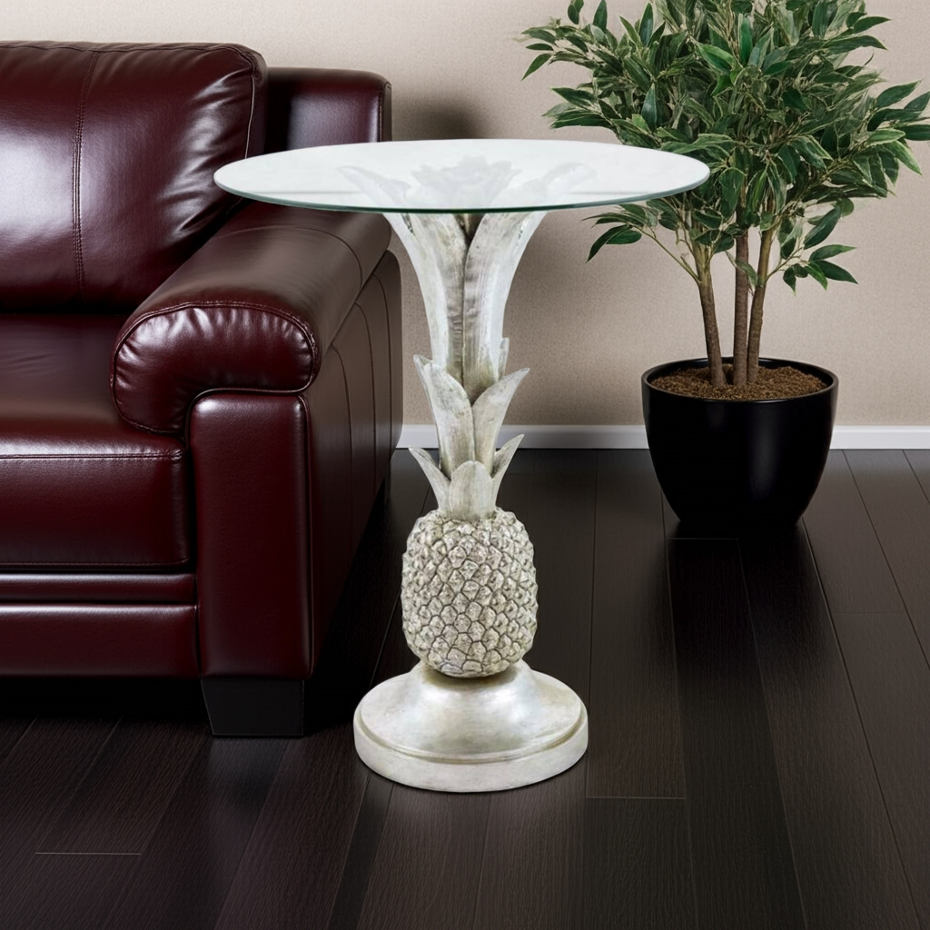 Add a touch of elegance to your space with our SILVER PINEAPPLE GLASS TOP SIDE TABLE. Its amazing look and eye-catching design make it the perfect addition to any room. Crafted with a sleek silver finish and a comes with glass top, this table is sure to impress any guest.