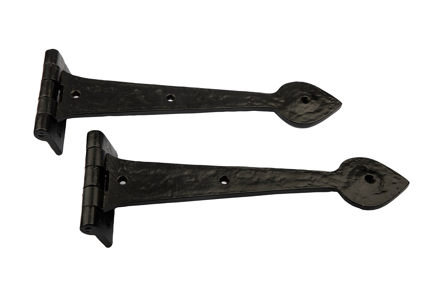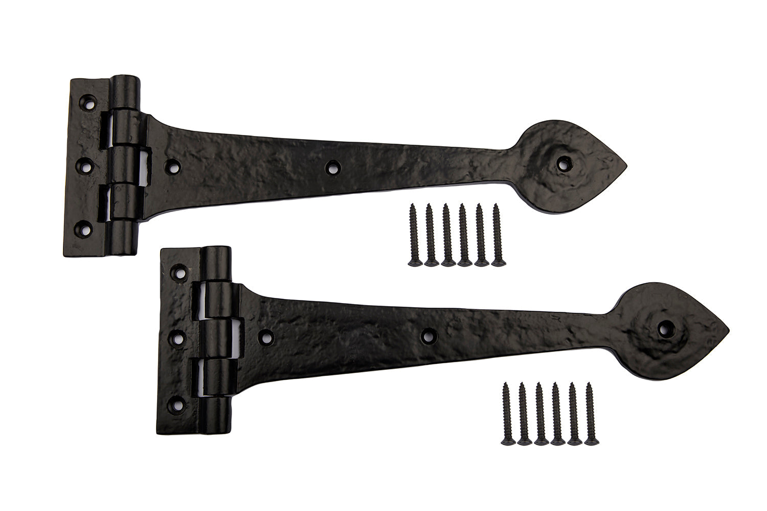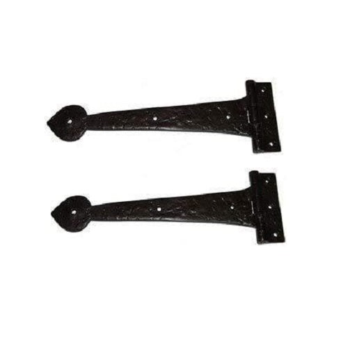 Carefully crafted with precision, our 12'' Spear End Door Tee Hinges feature a sleek black cast iron finish and come with matching fixing screws. Handcrafted with superior quality, these hinges are a perfect addition to your door and ensure long-lasting durability.
