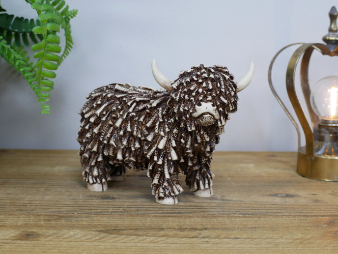 Crafted from durable resin, this Standing Highland Cow Ornament is designed for enthusiasts seeking an authentic decorative piece. Its robust construction ensures longevity, making it ideal for both indoor display and outdoor settings. The detailed sculpting captures the distinctive charm of Highland cattle, elevating any space with a rustic yet refined touch.