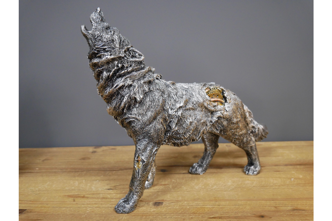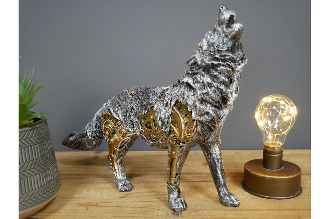 Steampunk Wolf is a meticulously crafted resin sculpture that merges Victorian-era aesthetics with wildlife artistry. This professionally designed piece features intricate mechanical details and industrial elements that celebrate the wolf's commanding presence. Perfect for collectors and enthusiasts who appreciate both steampunk design and animal craftsmanship, it serves as a striking decorative statement. Each piece demonstrates exceptional attention to detail, making it an ideal addition to any curated collection or display space.
