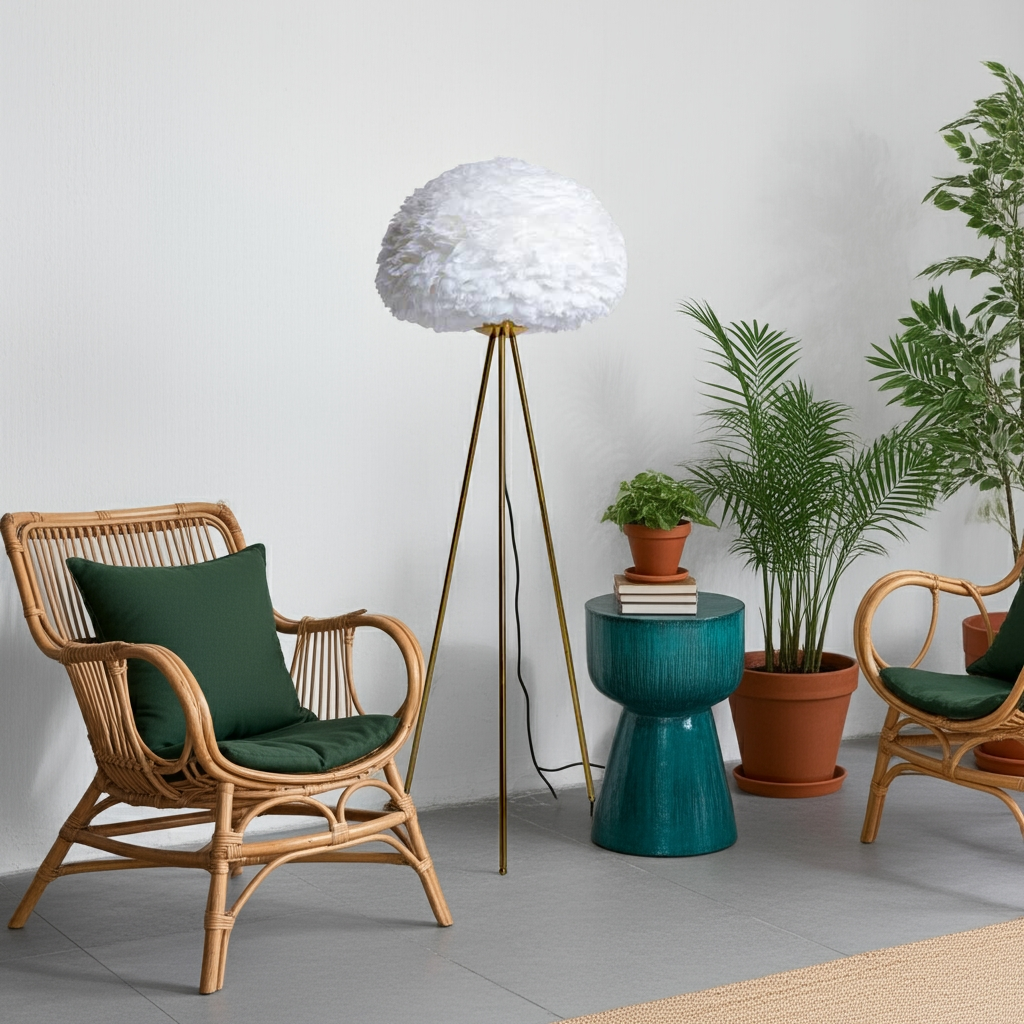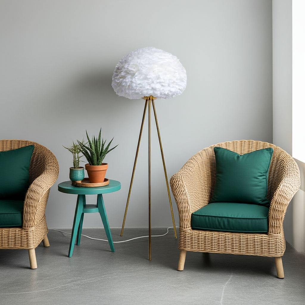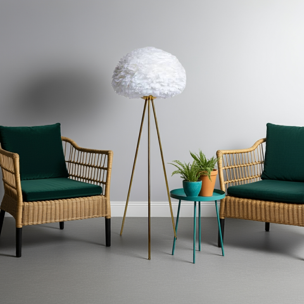 This Brushed Brass Tripod Floor Lamp is a stylish and elegant addition to any room. The soft White Feather Shade adds a touch of luxury and creates a warm, inviting ambiance. With its sturdy tripod base, this lamp provides both functionality and aesthetic appeal. Perfect for any modern or traditional interior design.